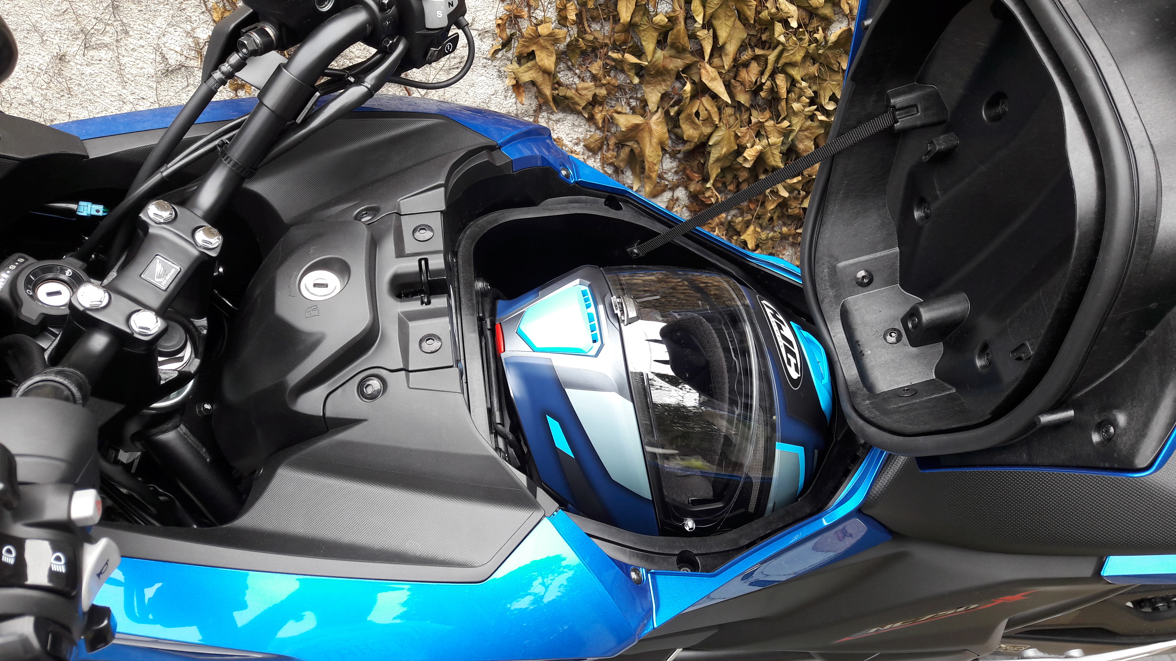 Mon HJC RPHA 90 (modulable) rentre, ça force un peu si je laisse la trousse à outils, ça passe bien si je l'enlève. Je vais essayer de la caser sous la selle près du feu arrière comme quelqu'un vient de le dire.