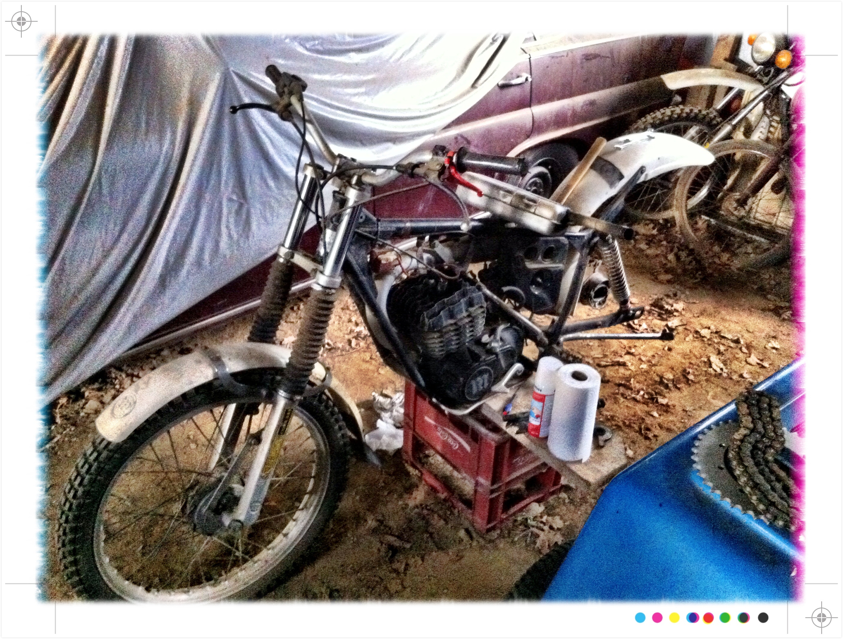 Je me suis porté au chevet de ma vieille dame, Montesa Cota 349 de 1980... Vous me direz, il y a plus ancien, c'est vrai. Ma plus belle ancienne (qu'on aperçoit dans le fond) est la Monet Goyon de mon père (1949).