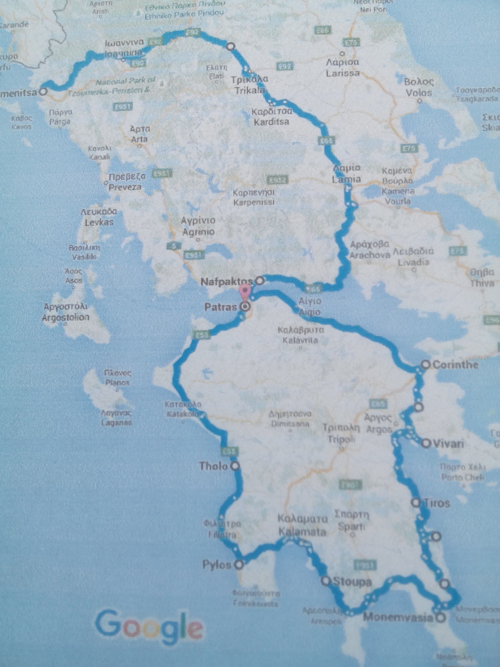 C'est par la Nationale 92 qui serpente à travers la montagne que nous arriverons à Kalambaka qui se trouve au pied Des Météores. Puis durant ces 15 jours de balade ,nous ferons halte à Delphes , longerons le détroit de Corinthe , pour arriver à Nauplie, puis descendrons sur Monemvassia par le bord de côte (superbe !) puis passage à Guitio,pour rejoindre Pilos via Stoupa et Kalamata. Et enfin nous ré embarquerons à Patras soit le tour du Péloponnèse.