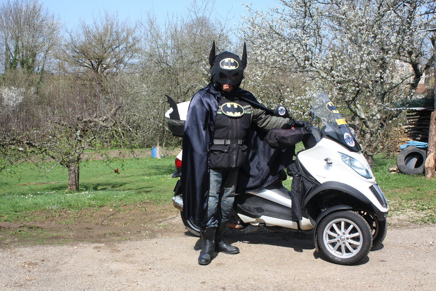 J'ai décidé de faire cette manif en MP3 et déguisé en Batman car le MP 3 est plus facile à transformer en "bat-mobile" que la 750 NC.