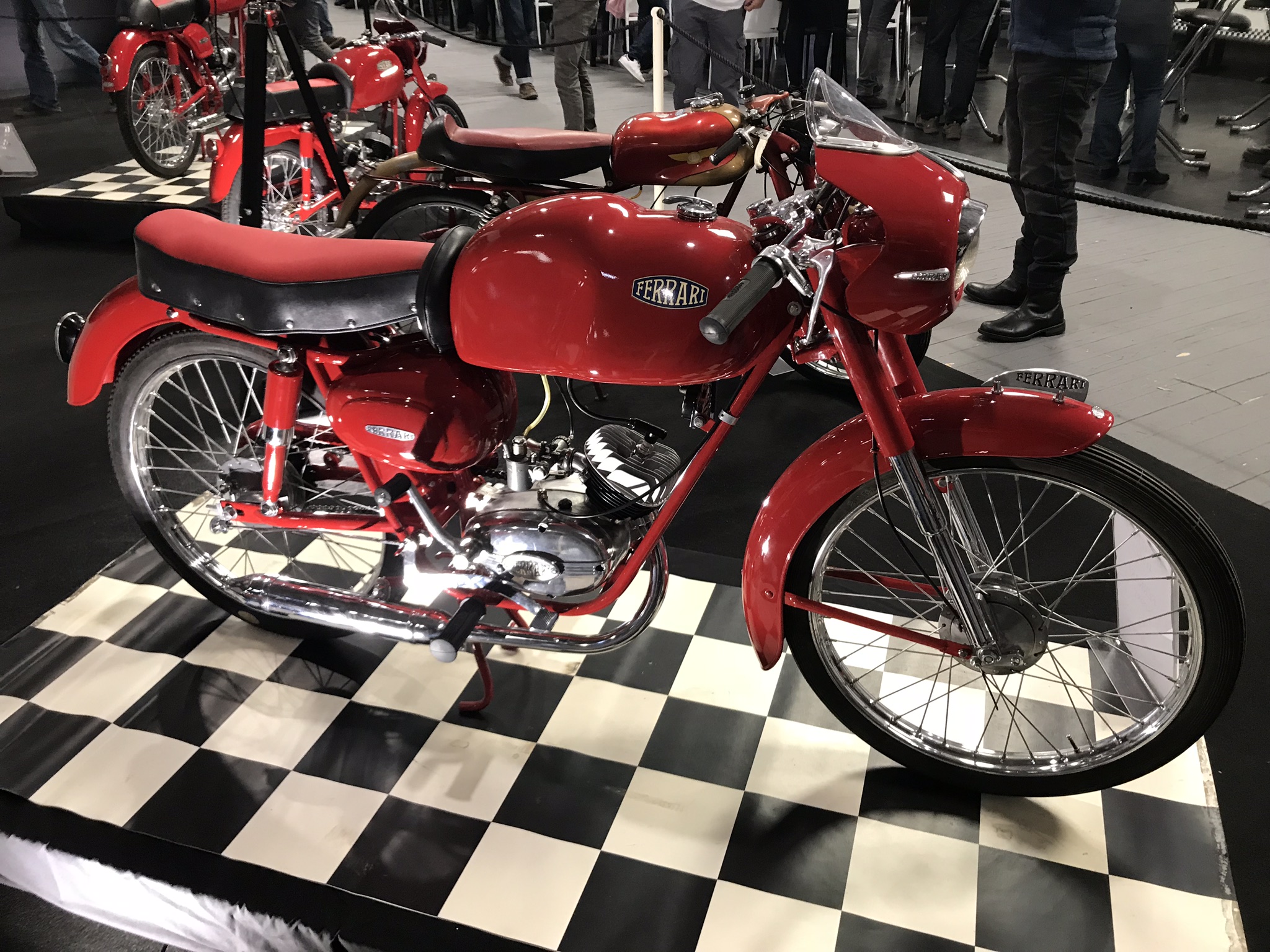 Nous entrons à l’expo pour y découvrir une motocyclette Ferrari 125 cc..ainsi que des MV, Benelli,....à l’état Concours...