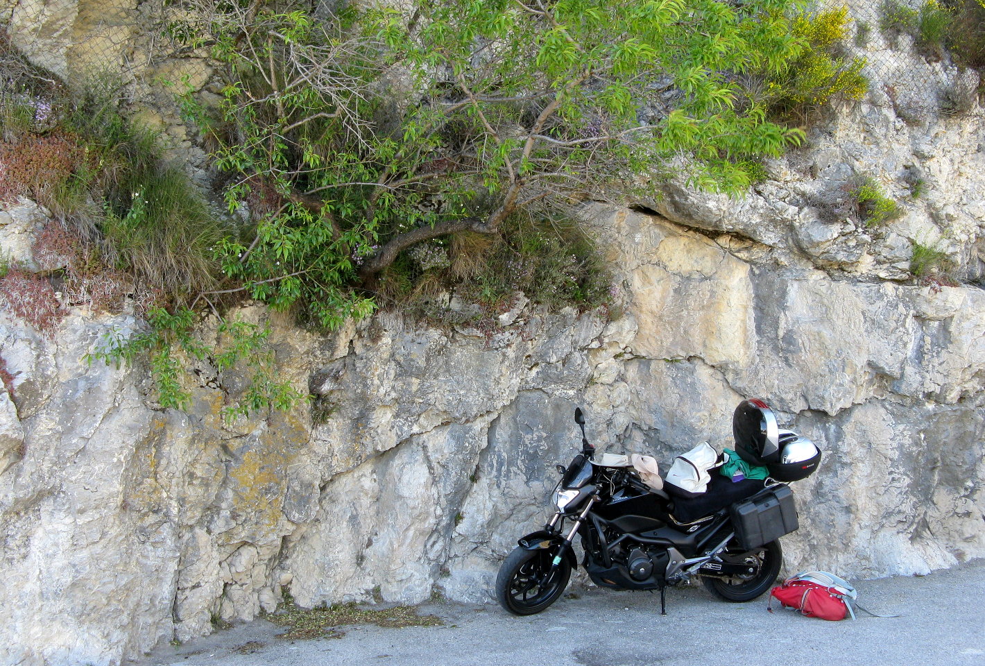 La moto avec les chaussures de marche, voilà notre menu dominical; Aujourd'hui 2 heures de routes tordues (de Grasse 06) vers Annot (04), puis 3 ~ 4 h sur les sentiers escarpés des "Grès d'Annot", casse-croûte dans le sac à dos. Pas de champignon, mais de belles châtaignes, malgré la concurrence. Retour par la grand-route, la 202 - qui grimpe sur la photo- puis la 85... Température fraîche, mais c'est pas encore l'hiver: Profitons !