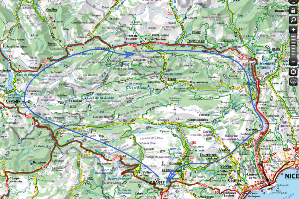 La suite de la 202 est plutôt reposante, il suffit d'avoir l’œil sur les autos; ah, un radar fixe. Tout en bas, pour éviter le littoral, on coupe par Vence: une grosse dose de virages pour finir la journée !