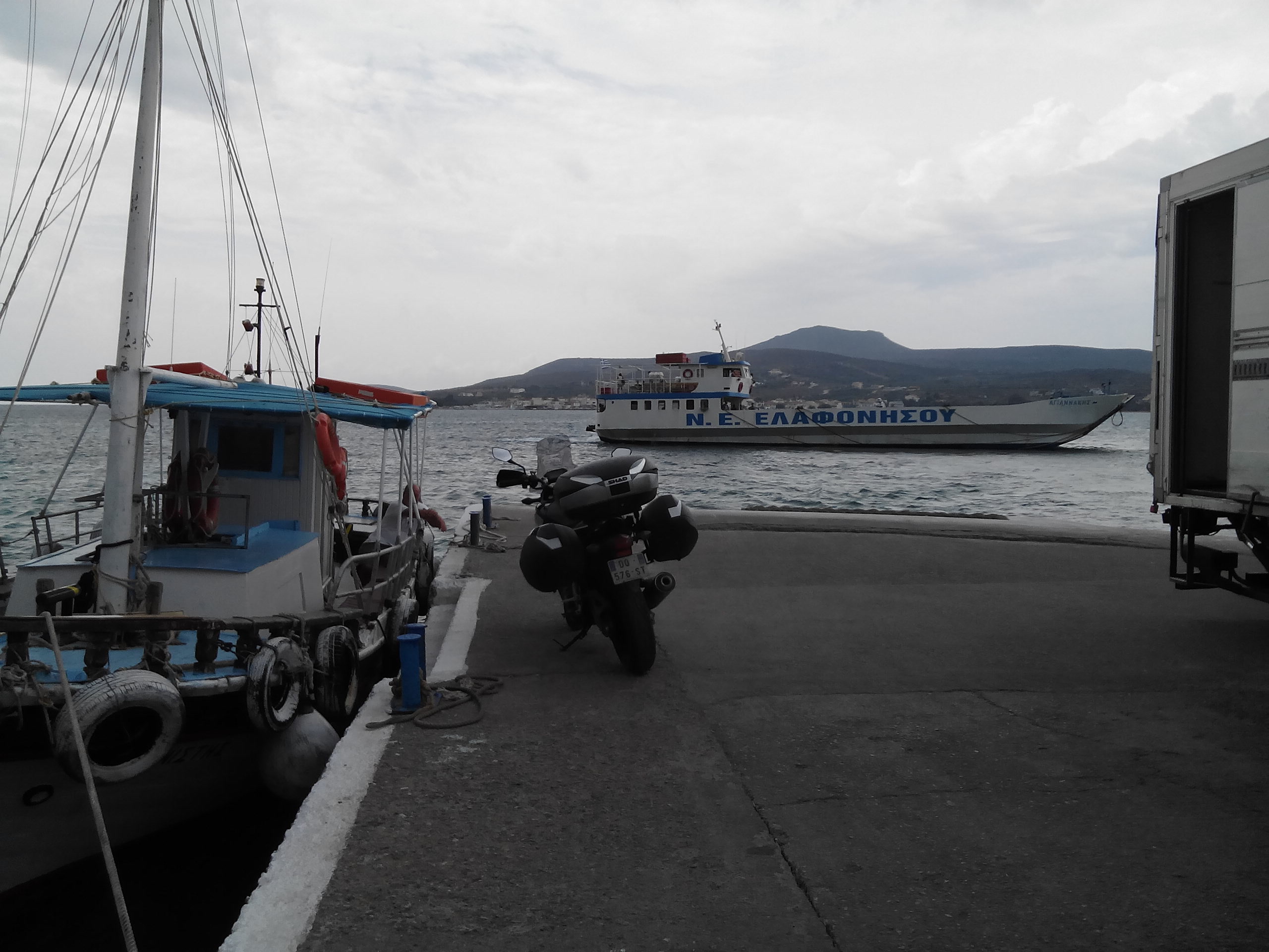 Départ à 5h du mat en direction du port d'Ancone en Italie via Grenoble,tunnel du Fréjus,Turin,Parme,Bologne,Rimini soit quasiment 900 kms d'autoroute ! (nous avons apprécié la selle confort!) Embarquement à 17h dans le ferry ou nous naviguerons jusqu'à Igoumenitsa .