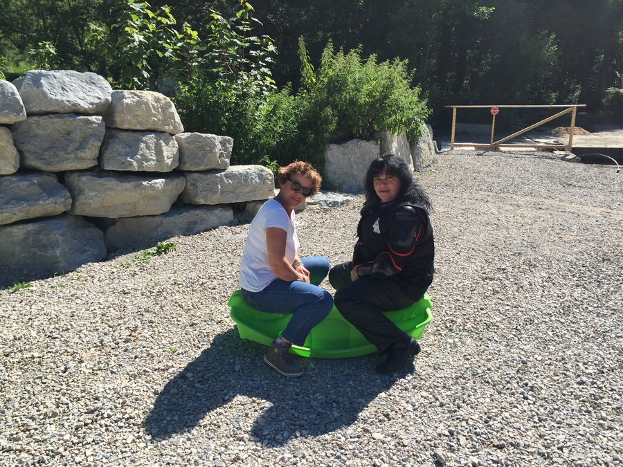 Local flambant neuf Laeticia au service et Kathia à la cuisine. On peut manger sur place les truites pêchées dans le bassin