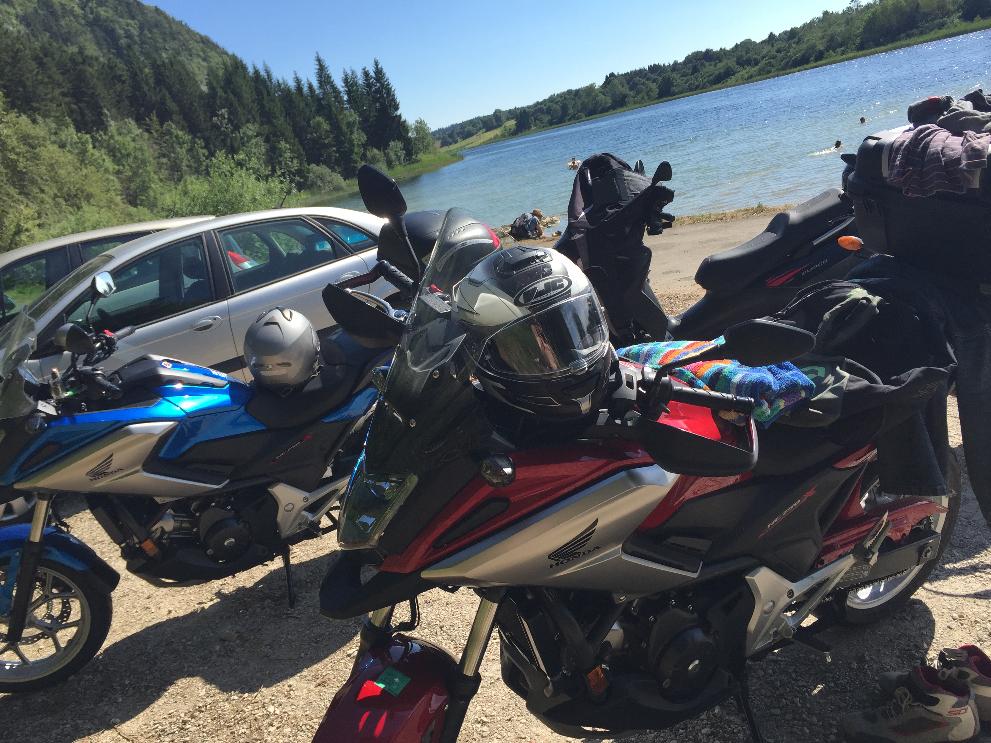 Pendant que les motos et scoots refroidissent, une partie de la troupe se rafraichit dans ce lac qui nous a surpris par la T° de l'eau (de l'ordre de 25 °)