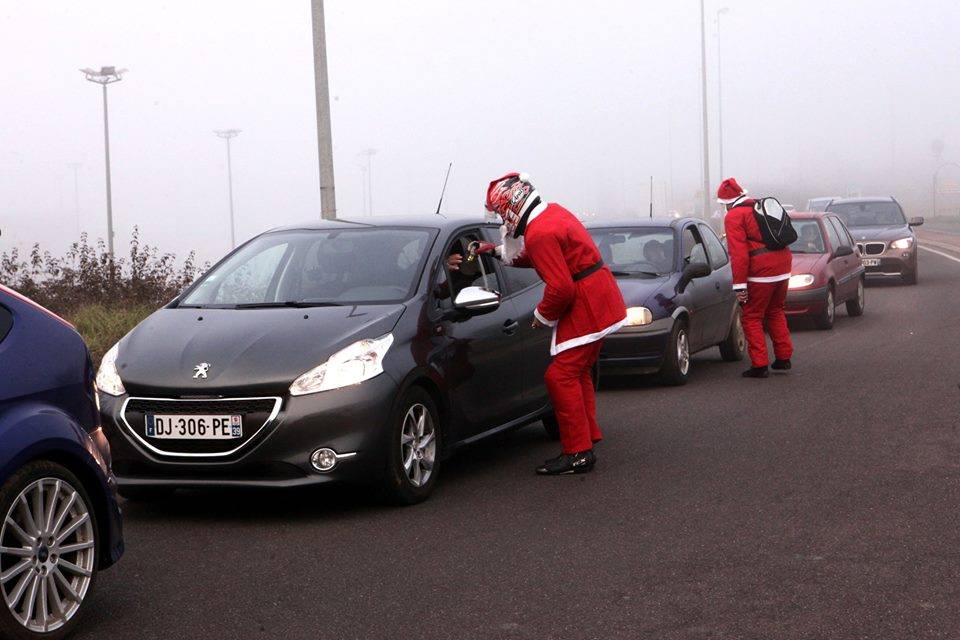 Puis départ par un autre axe avec arrêt sur un rond-point et distribution de papillotes . Toujours dans la bienveillance des automobilistes.