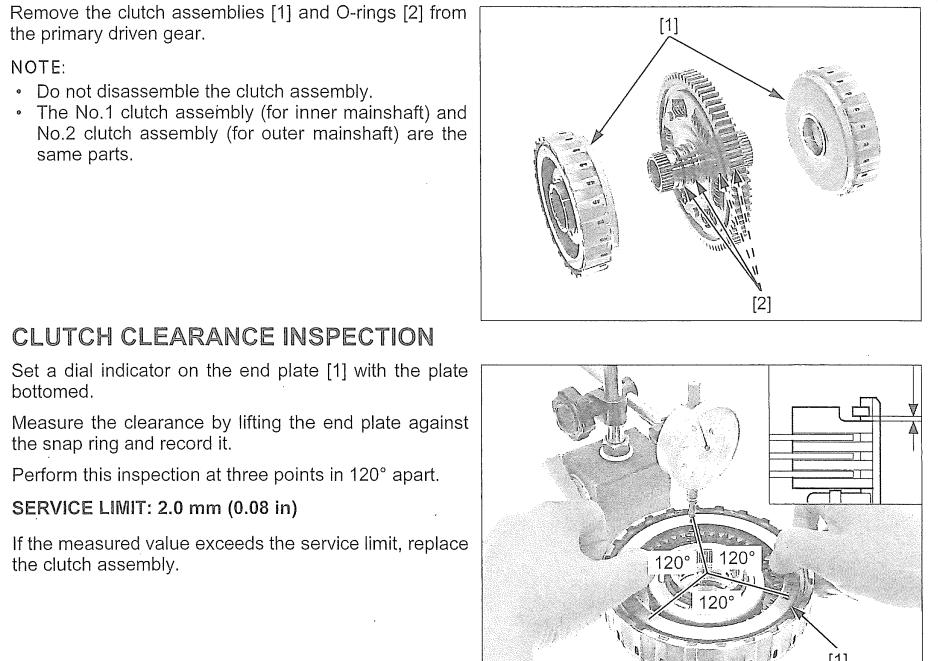 pour DCT, mesure sur la cassette assemblée, jeu inférieur à 2 mm ok . (sinon, remplacement de "the clutch assembly", tout en bloc, oui ).