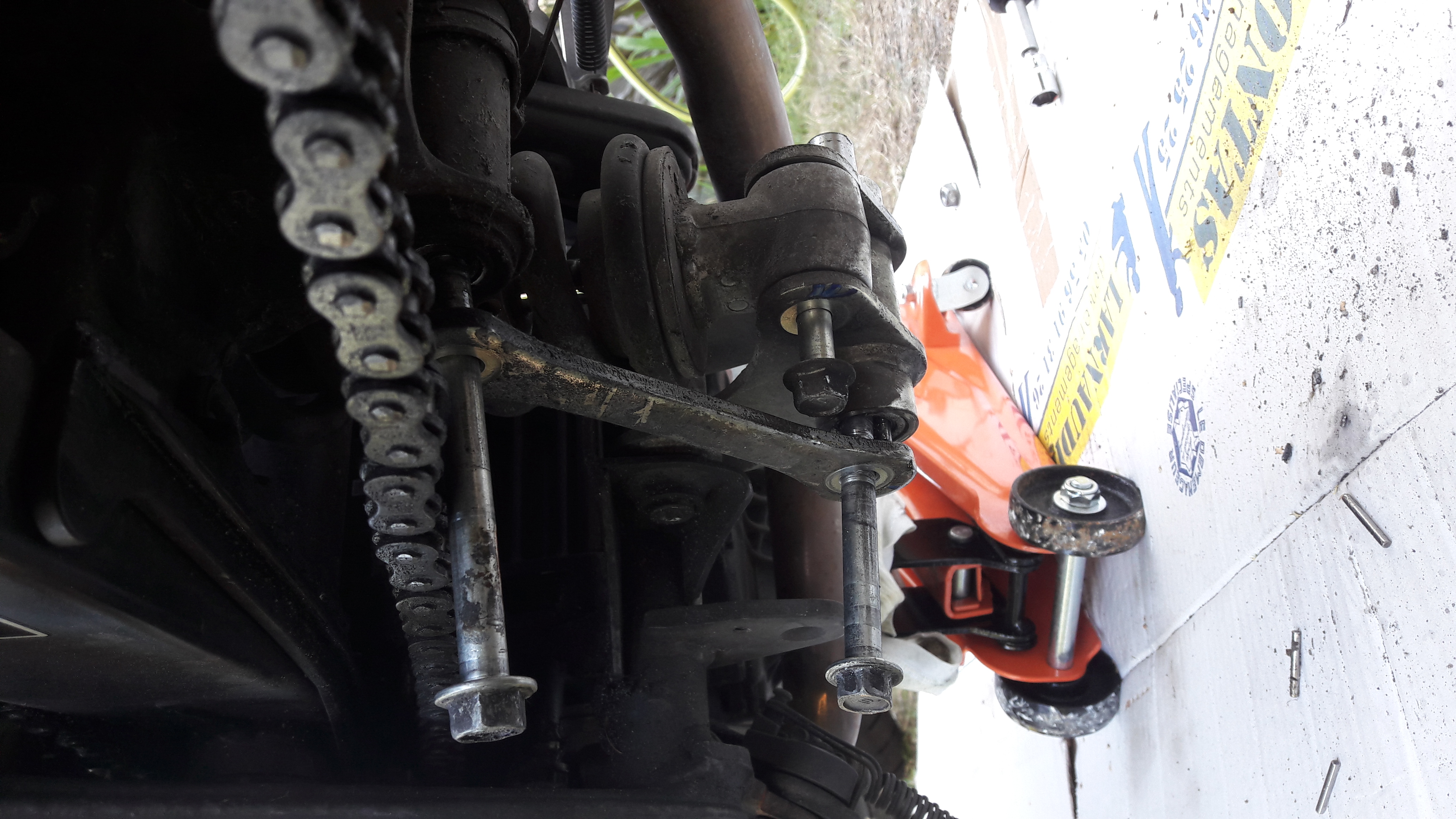 Pour ce qui est de sortir le grand axe des biellettes, tu as essayé en soulageant un peu la roue arrière (limite en la faisant toucher le sol) pour éviter que le poids du train arrière complet génère de l'effort sur les axes ?
