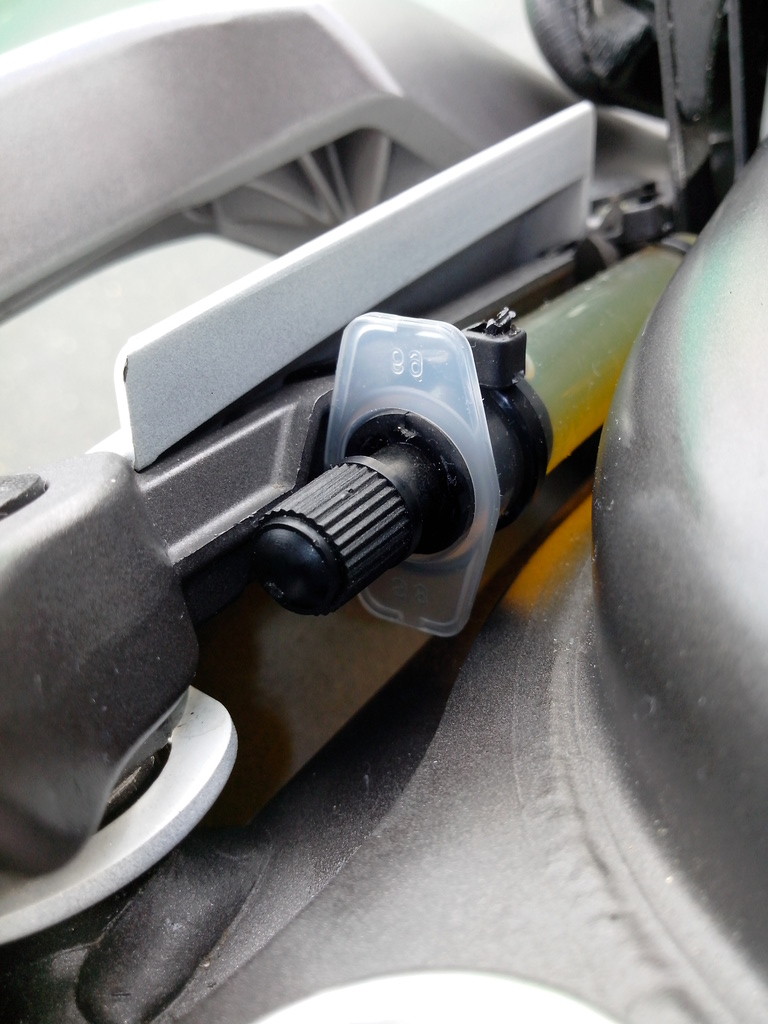 Ton système m'a tout l'air d'être parfaitement au point, et les seules choses que j'y ajouterai seront des fixations du tube de laiton différentes (tjrs à base de rislan), peut-être une seringue plus grosse (selon place dispo) et une tentative avec en plus de la valve Schraeder vidée une Presta au bout de qques cms de durite, qui permettrait de fermer le circuit sans intervention.