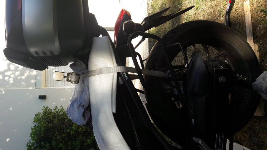 Sans succès. C'est l'assiette de la moto qui travaille. La roue arrière ne se lève pas d'un millimètre. Du coup ça ne soulage pas pour libérer les longues vis. L'arrière a besoin d'être levé d'un point plus haut, genre poulie.