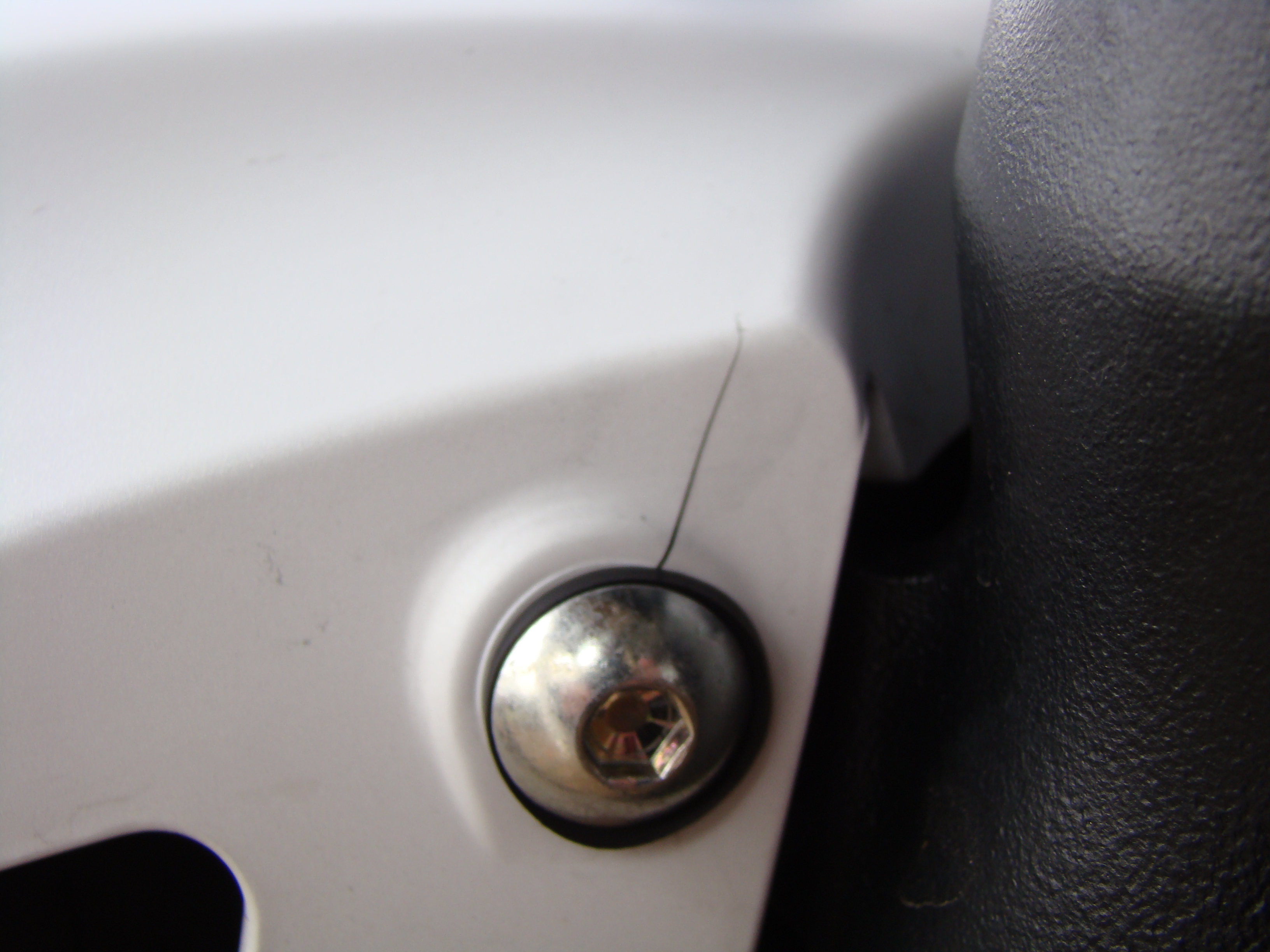 J 'apercoit qu'un trait noir au droit d'une des vis de fixation du garde boue , je regarde de plus pres , en réalité le garde boue est fendu , sur le blanc , cela se voit tres bien