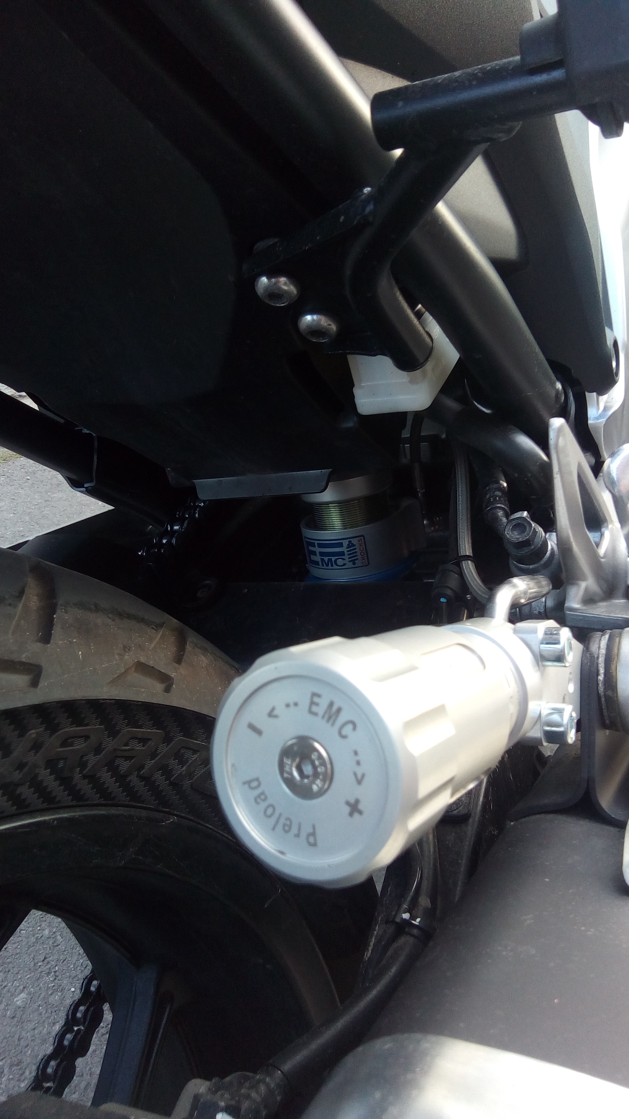Je me suis offert a Noël un amortisseur emc avec option de réglage hydraulique. Bon, c'est pas donné,mais c'est bien pratique,pour l'avoir utilisé sur le Pan.Juste une molette a tourner pour régler le tout !