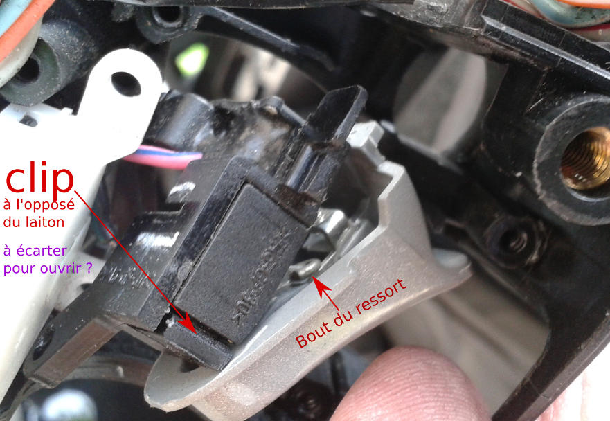 Démonté...sans ouvrir le poussoir du klaxon lui-même. Si je devais le faire, j'ouvrirais le clip indiqué sur la photo