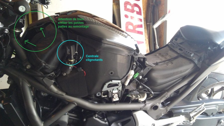 .<br />Voila une bonne vue d'ensemble<br />Vue qu'il n'y avait pas de tuto pour la &quot;S&quot; j'ai  démonté tous les carenages<br />mais il suffit de démonter le flanc du faux reservoir.