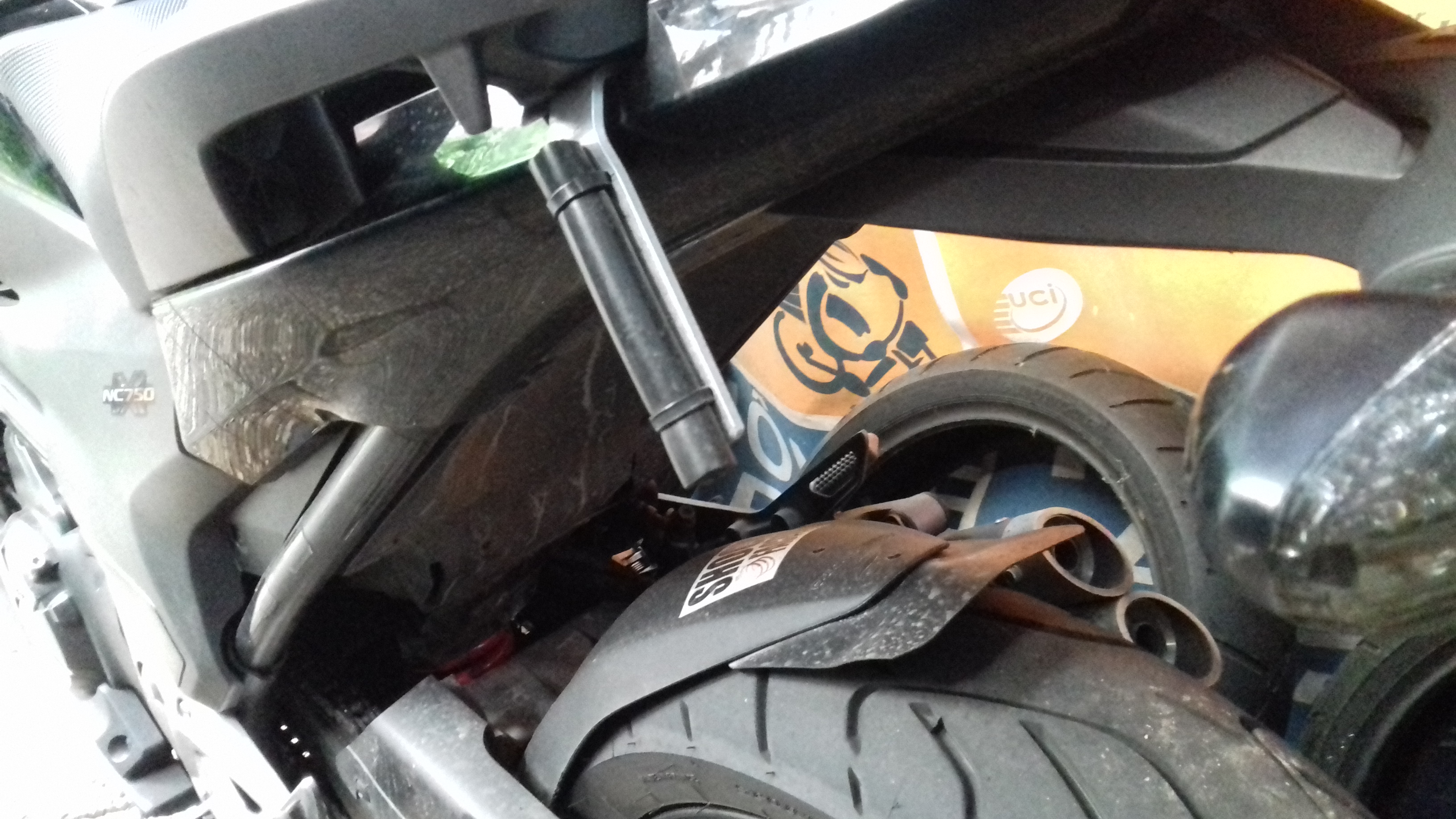Ma bidouille, une patte d'alu fixée sur une des vis des poignées passager, sur laquelle est fixé un bout de durite.