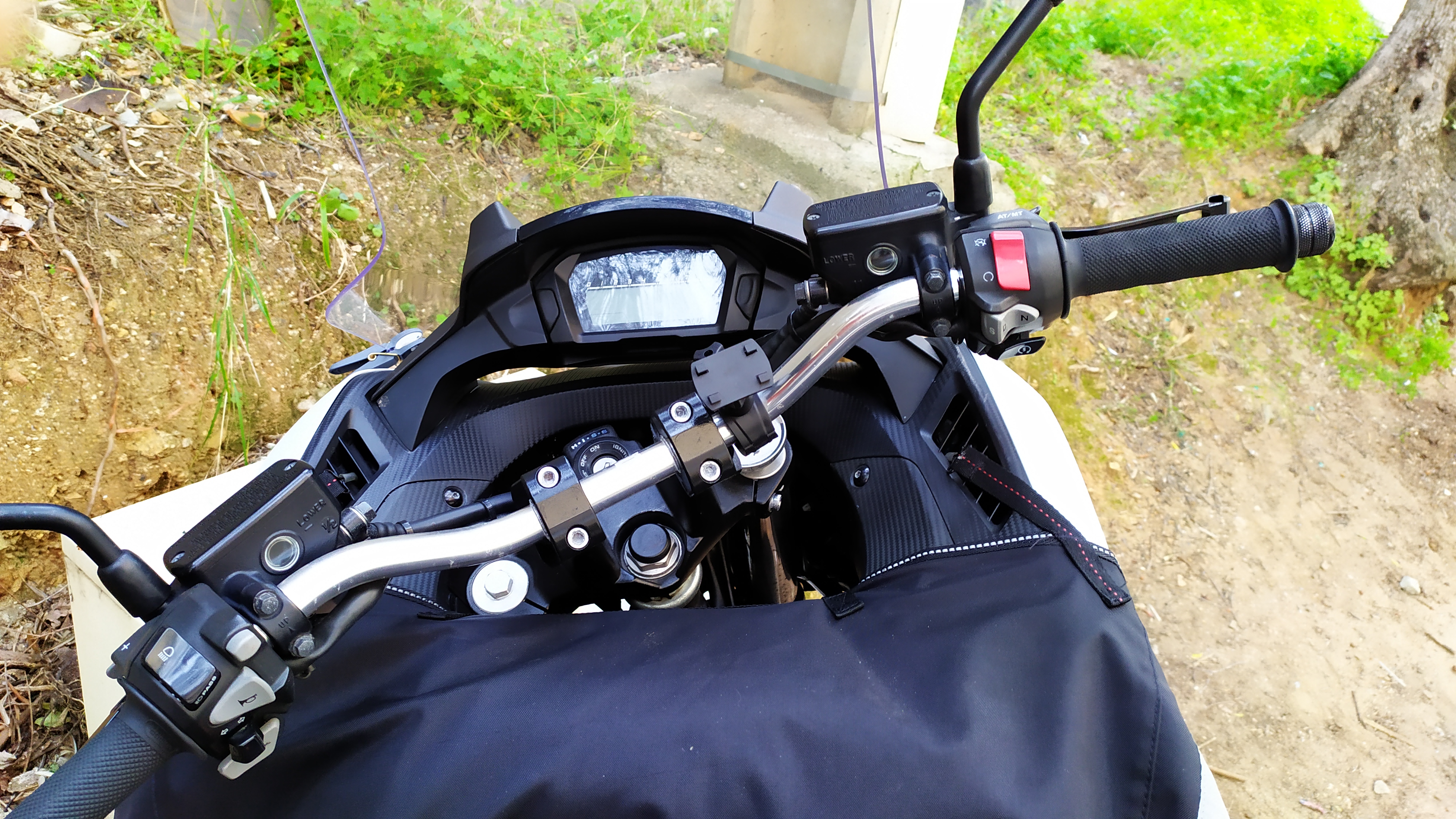 Honda NC700S DCT remplacé par un Suzuki V-Strom 650 M1 et toujours mes manchons Givi pour garder les mimines au chaud l'hiver