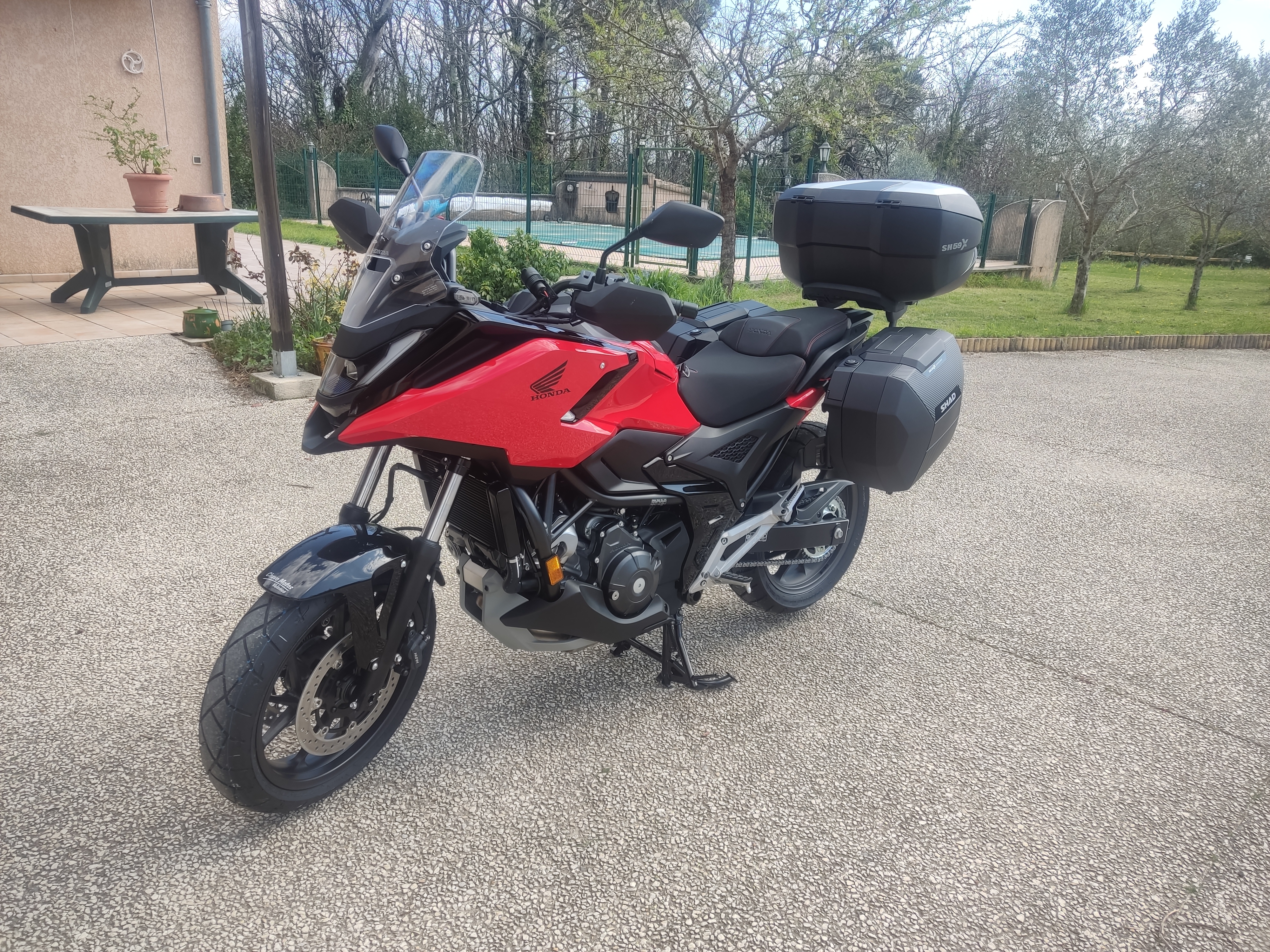 NC750 XD rouge. Top case, béquille centrale, poignées chauffantes.