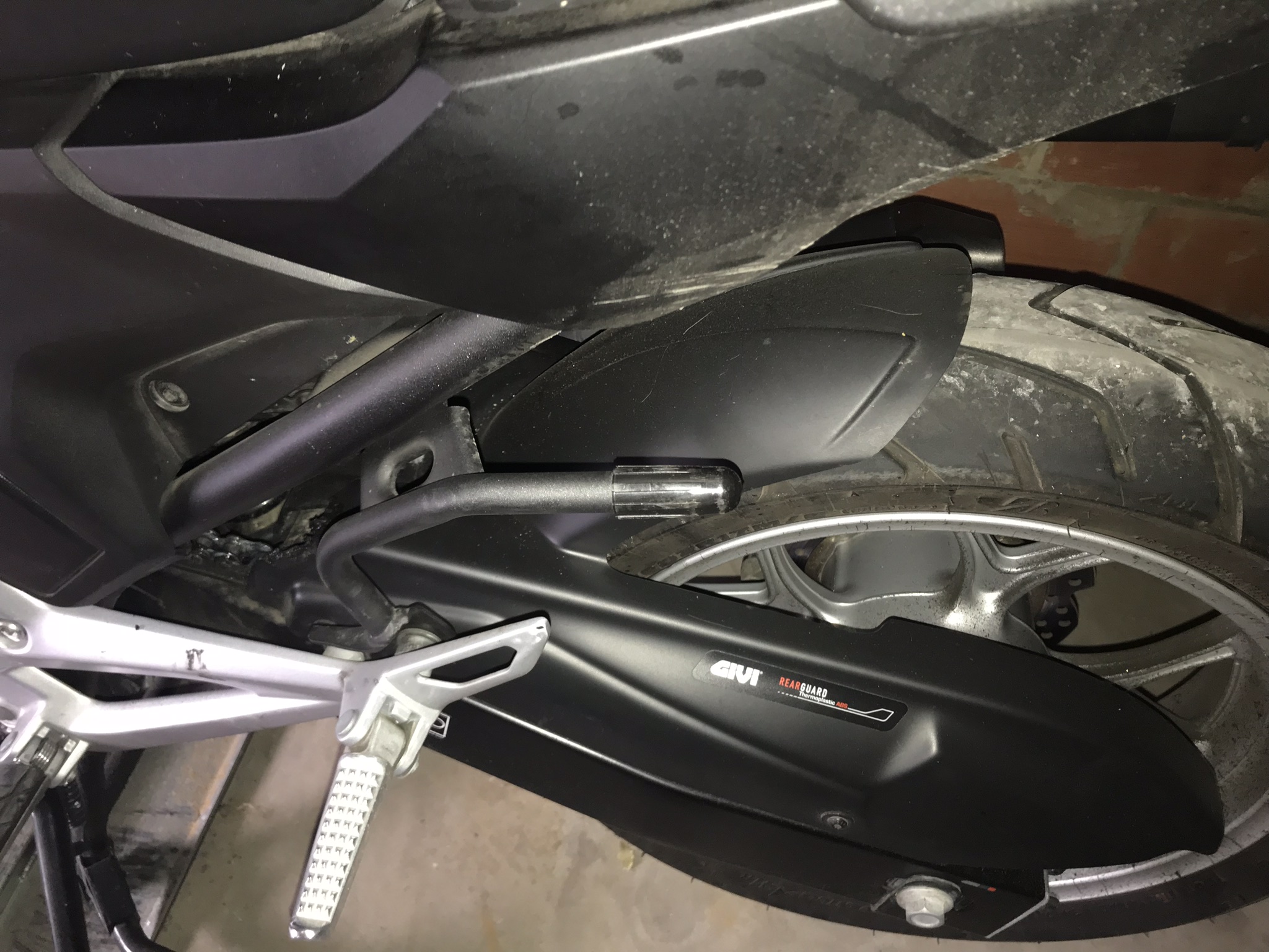@ EDE avec mon garde-boue Givi pas de projection d’eau...sauf pour les mains de madame lorsqu’elle se tient aux poignées de maintien...