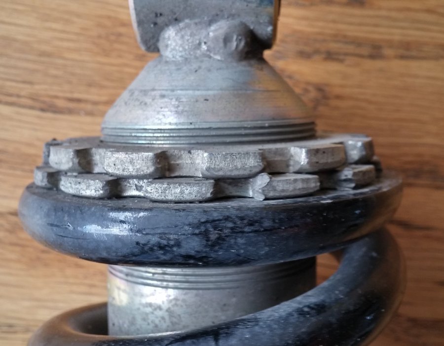 A voir le montage, si la bague qui retient le ressort est bien filetée jusqu'en bas, elle n'a aucune difficulté, vu le nombre de filets en prise, à retenir le ressort. La 2ème bague n'est là que comme contre-écrou afin que la 1ère ne risque pas de se dévisser.