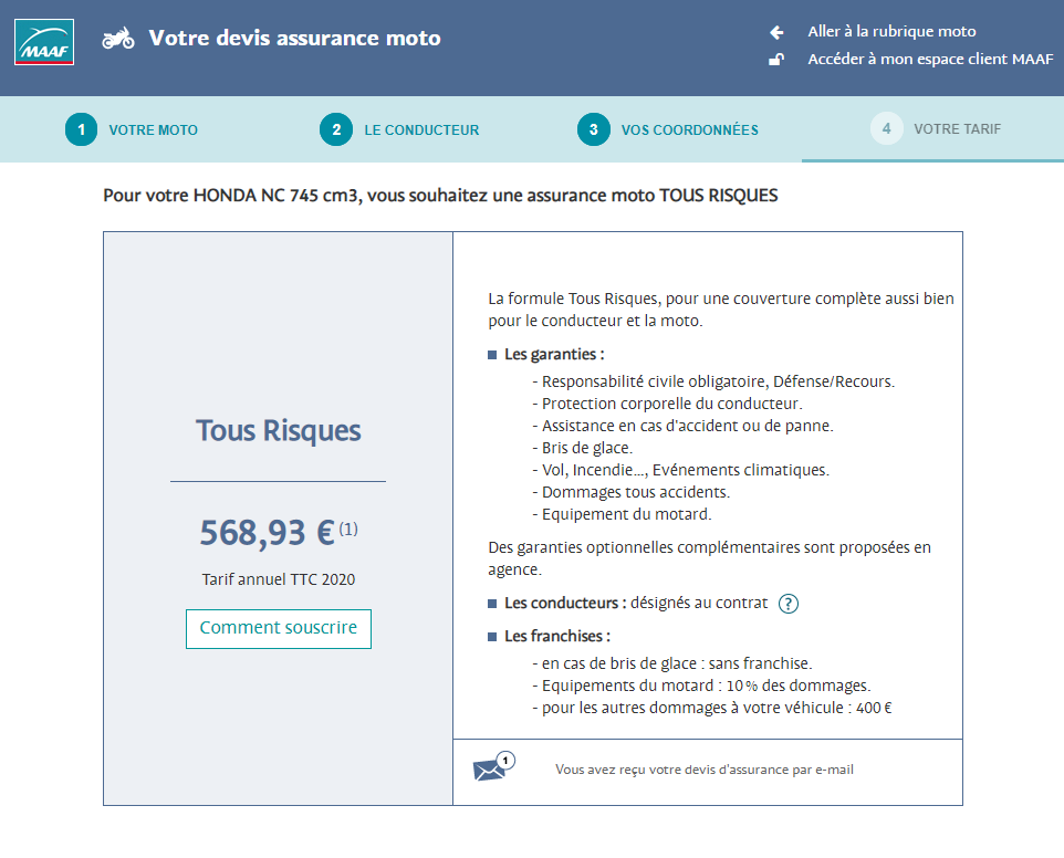 Tu peux aussi faire un devis sur honda assurance pour toi. Ça nous donnera une idée des tarifs qui te sont proposés :)