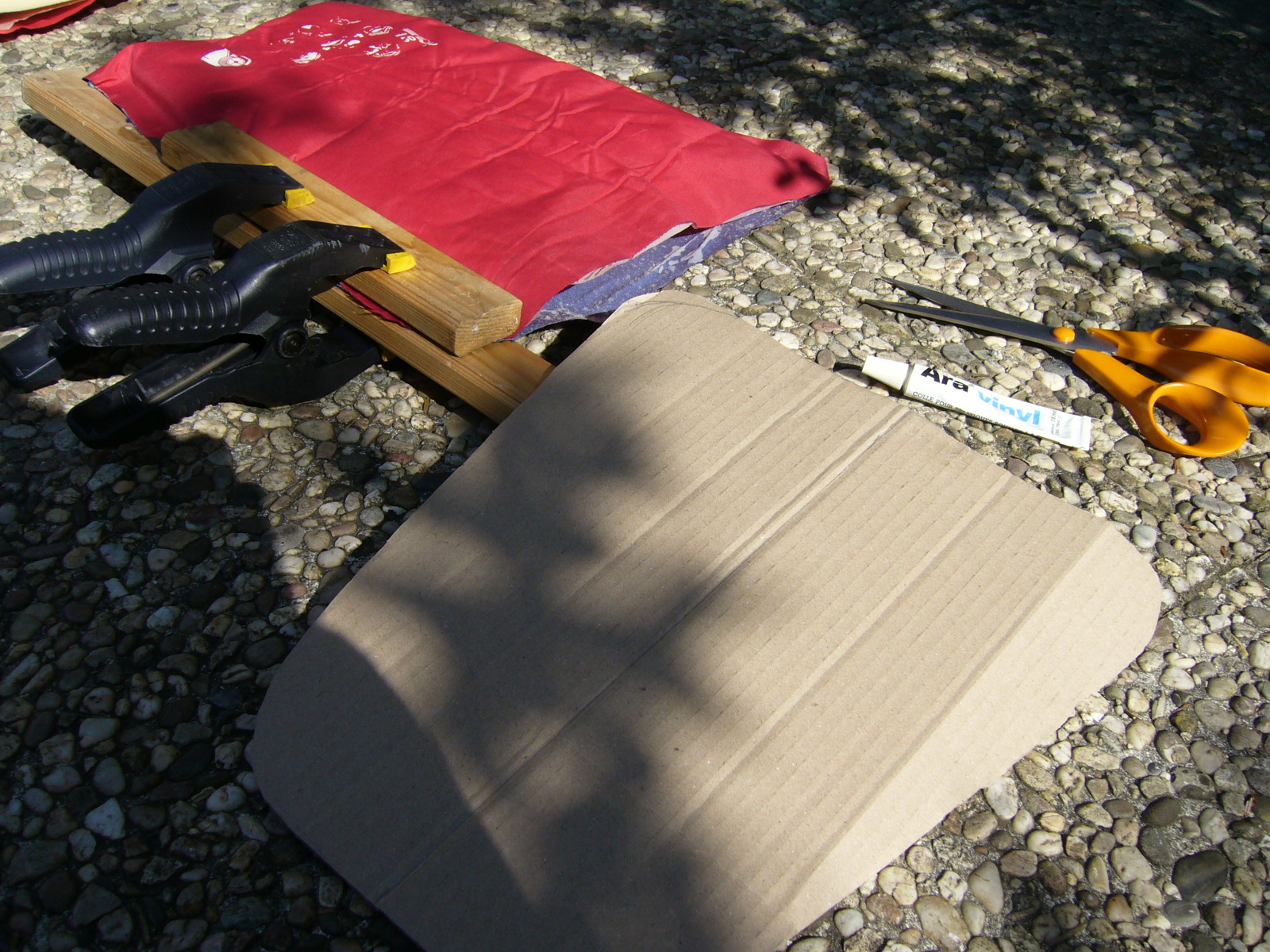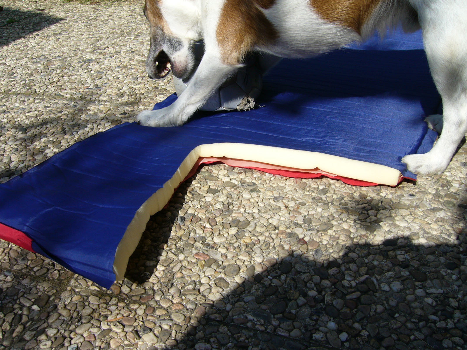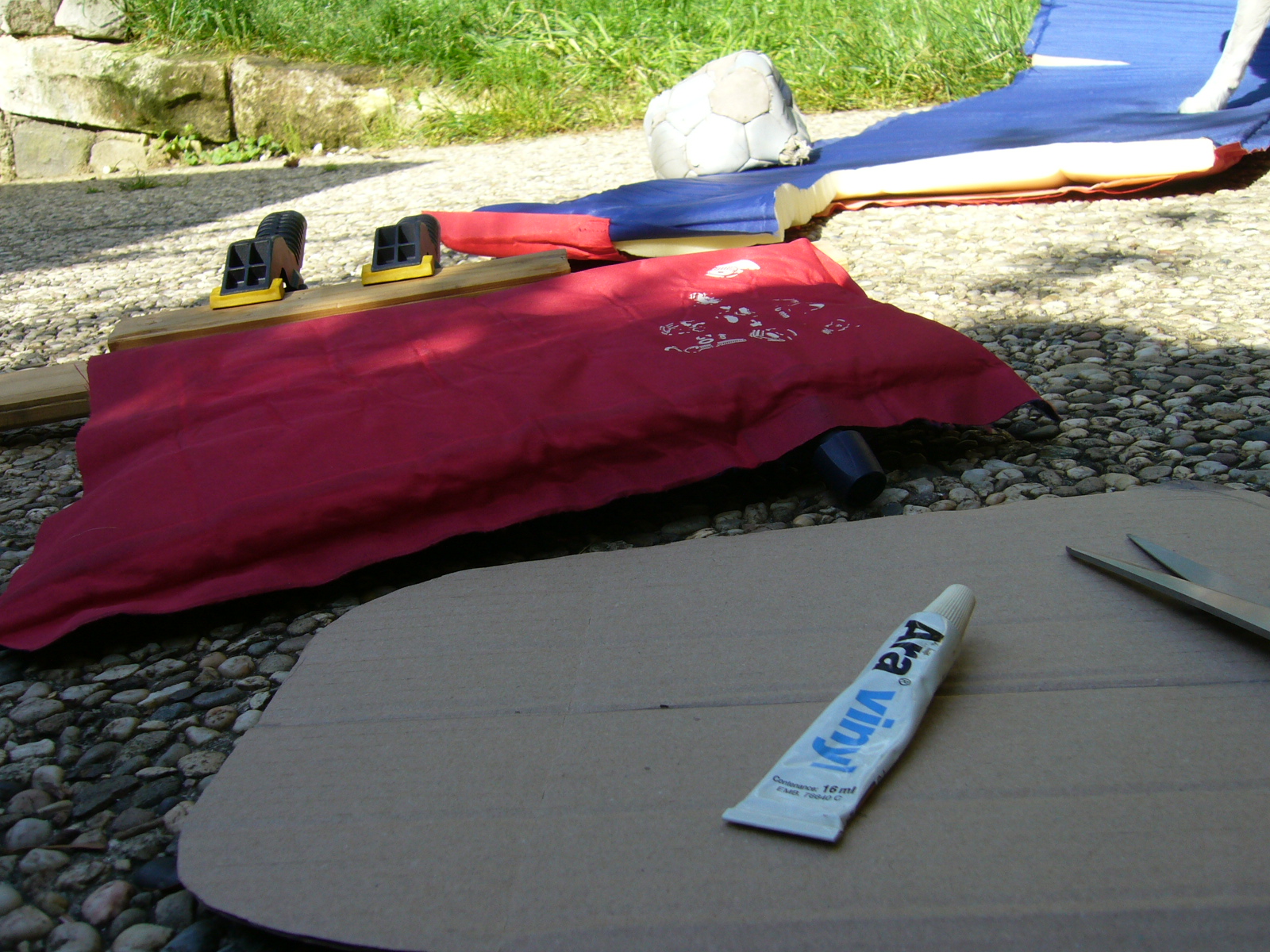 Le truc bleu à l'avant est un bout de tapis de gym resté là... Pour un premier essai, il couvrait tout le coussin, mais c'était trop ferme. (Je crois que Clod a trouvé la bonne mousse, un tapis assez récent, plus souple, élastique )