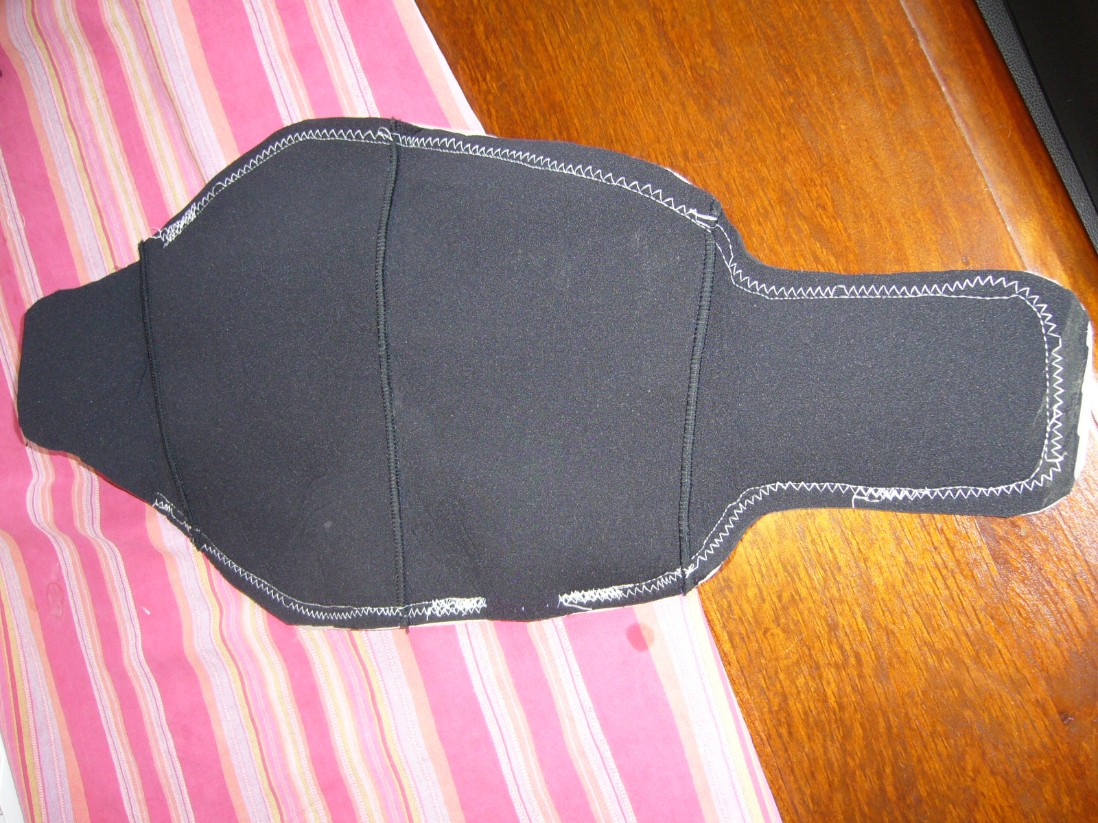 La housse. C'est pas évident, c'est la partie visible ! J'ai pas cherché loin: Un tissu éponge noir, assez solide, cousu pour faire un tuyau de 80 cm de circonférence, fermé à l'avant (c'est le plus pénible), ouvert à l'arrière pour déhousser.