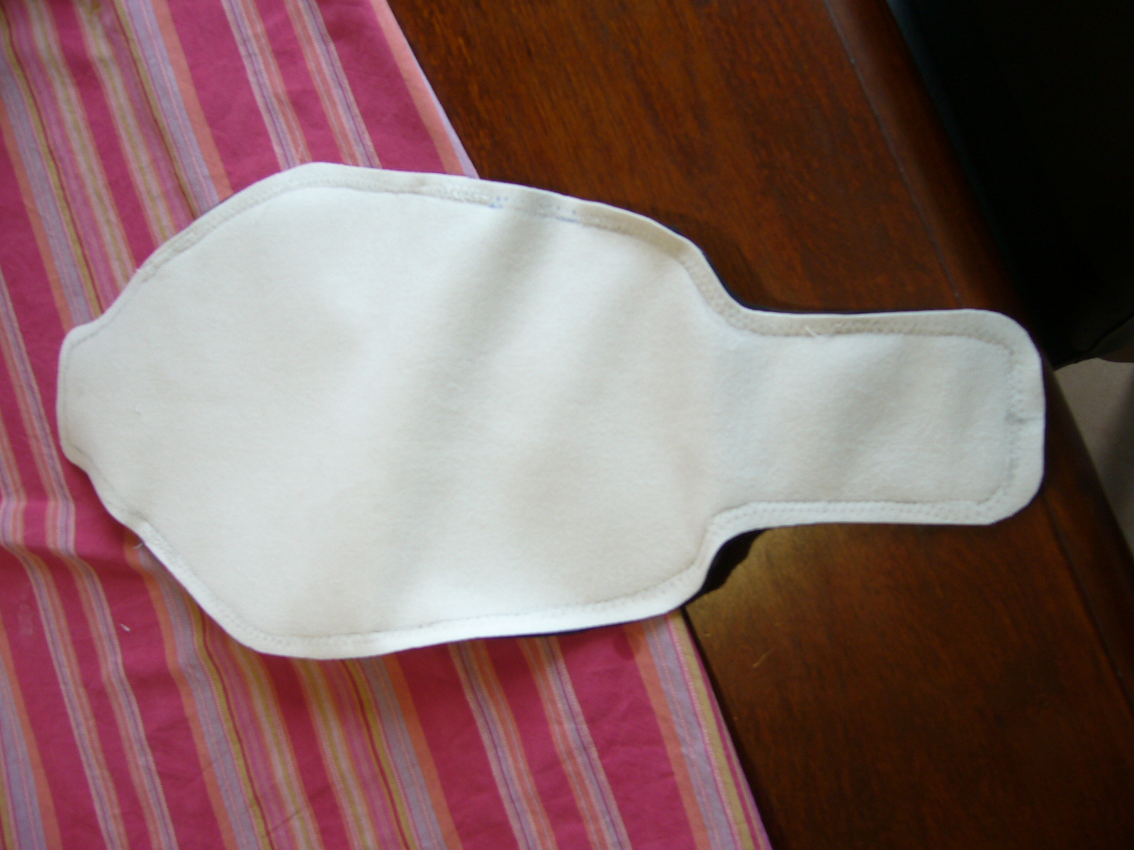 Pour moi, le premier point était l'élargissement de l'assise. Passée à 31 cm (comme la partie avant de la selle -> dessinée en vert ) par deux bourrelets (on parle du coussin, hein) de mousse très ferme (récup emballage, c'est vraiment dur), hauteur de ~6cm sur les côtés. Le centre est troué (on voit du bultex jaune), sinon c'est une planche. ( Si ces bourrelets ne sont pas fermes, on n'élargit pas l'assise :-/ )