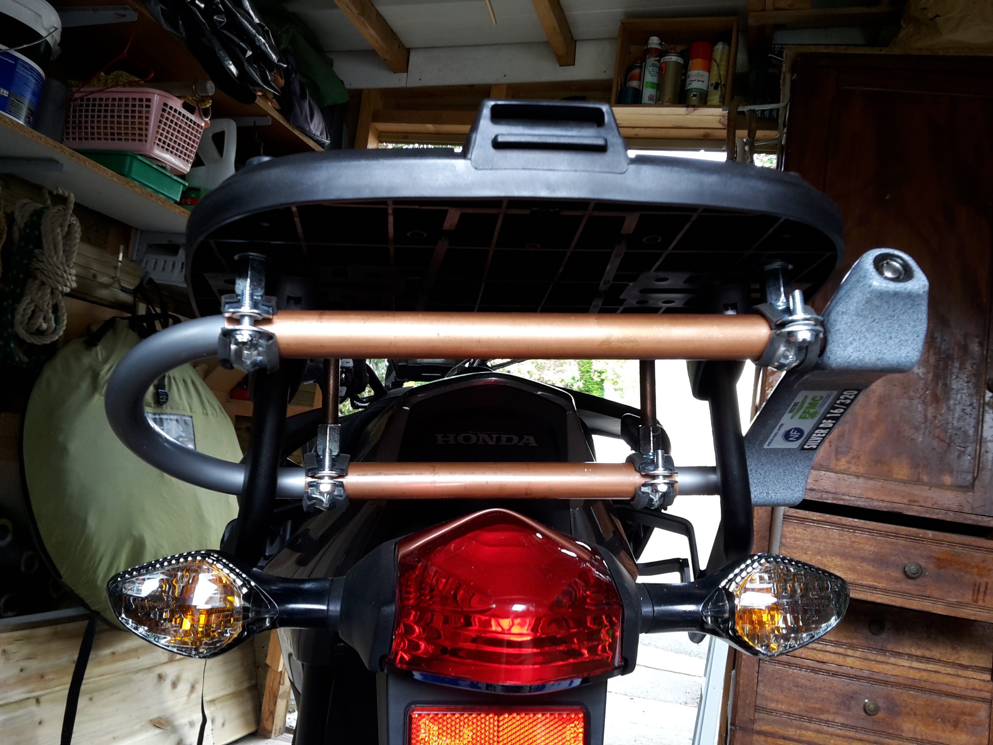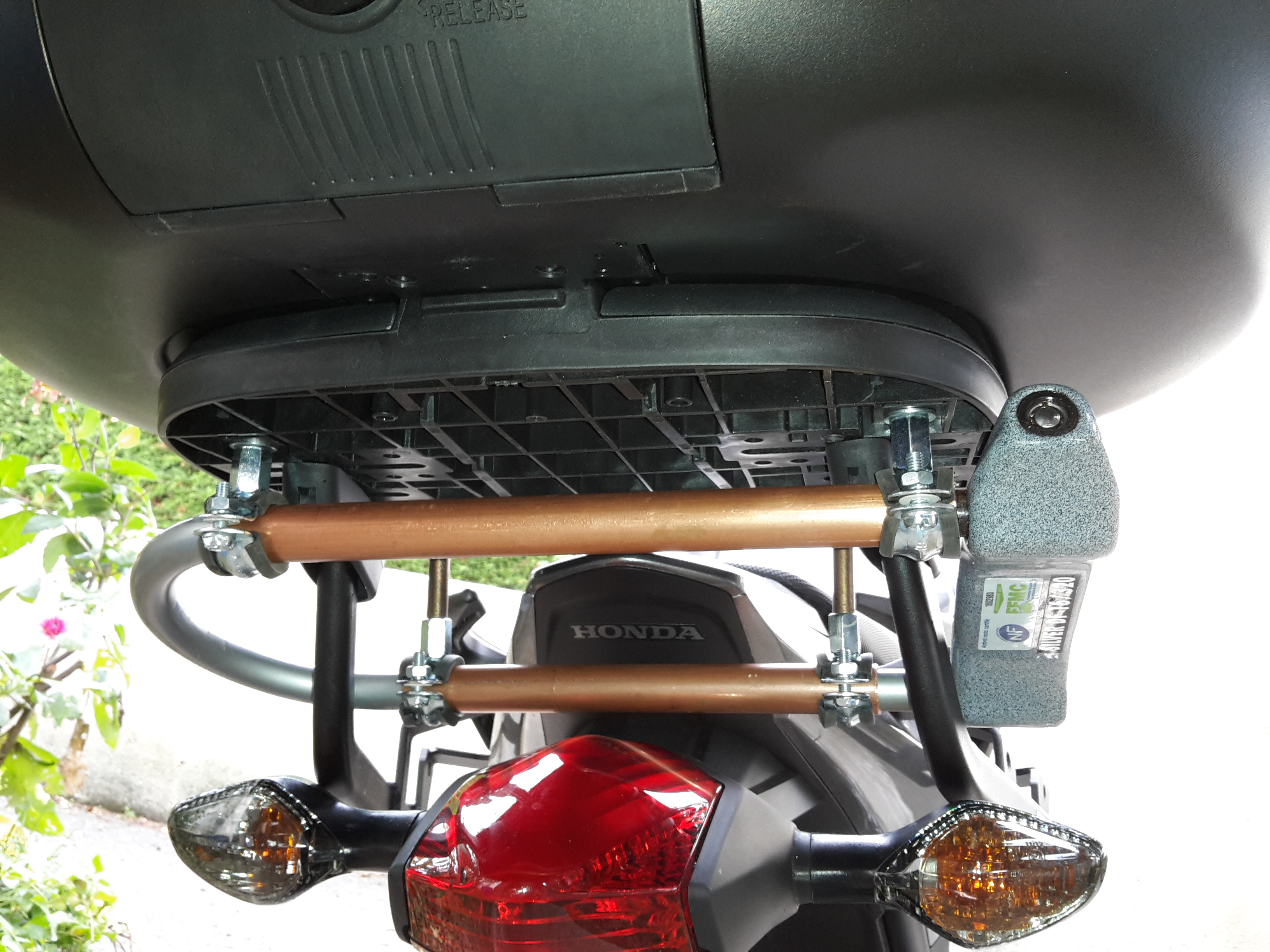 Moi, j'ai bricolé ça: tube cuivre 20/22 - collier de serrage Müpro 3/8 - top-case SHAD 48 L - U: Top-Block 16/320