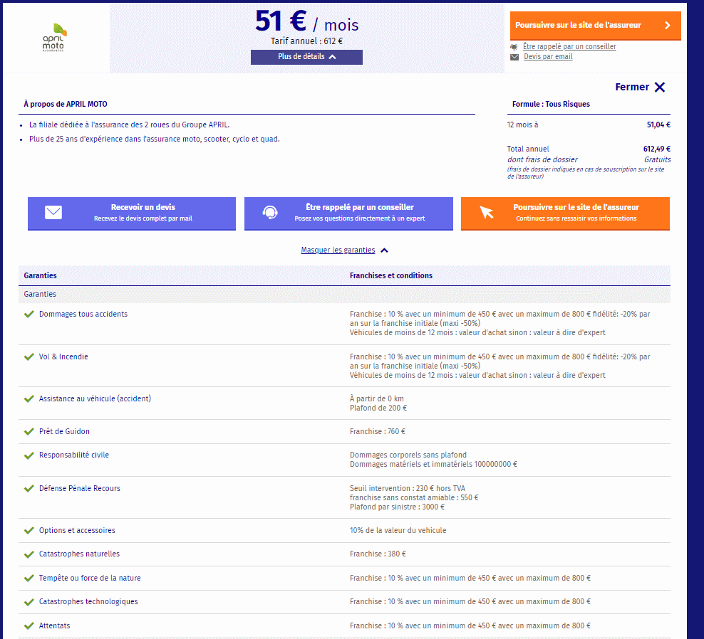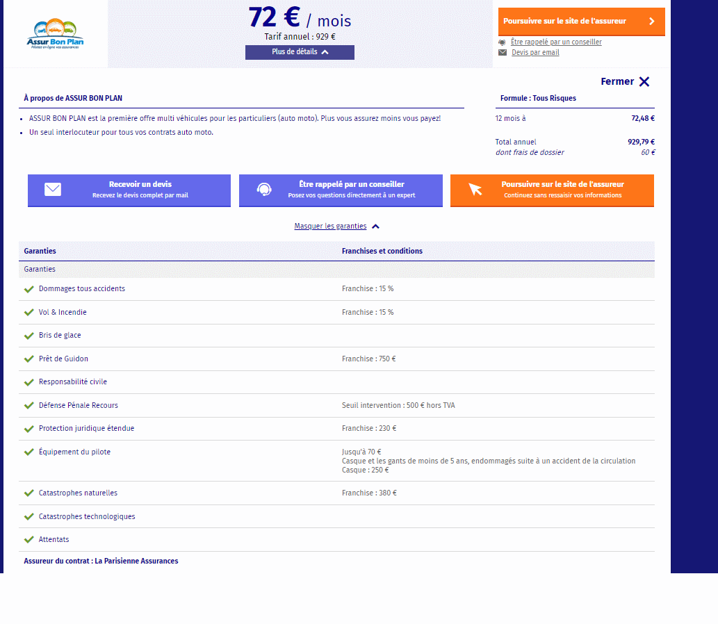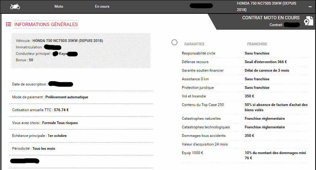 Mais voici mon contrat chez Honda Tout risques loisir + trajets travail - garage collectif fermé , avec 50% de bonus avec une option de remboursement d’acquisition pendant 24 mois https://www.honda-assurance.fr/#/