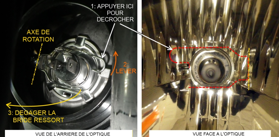 L'ampoule est maintenue plaquée sur l'optique par une bride-ressort (sorte de fil de fer).
