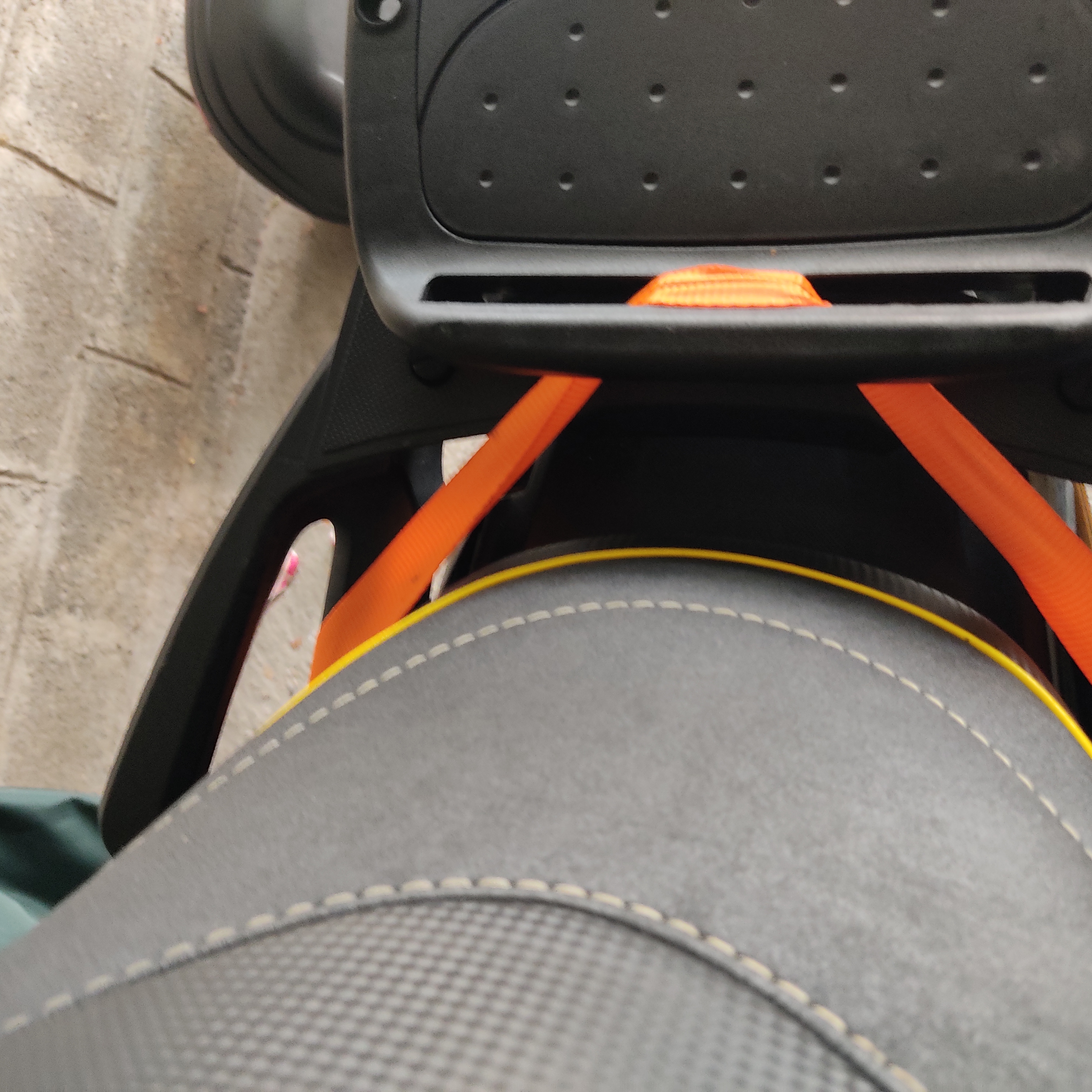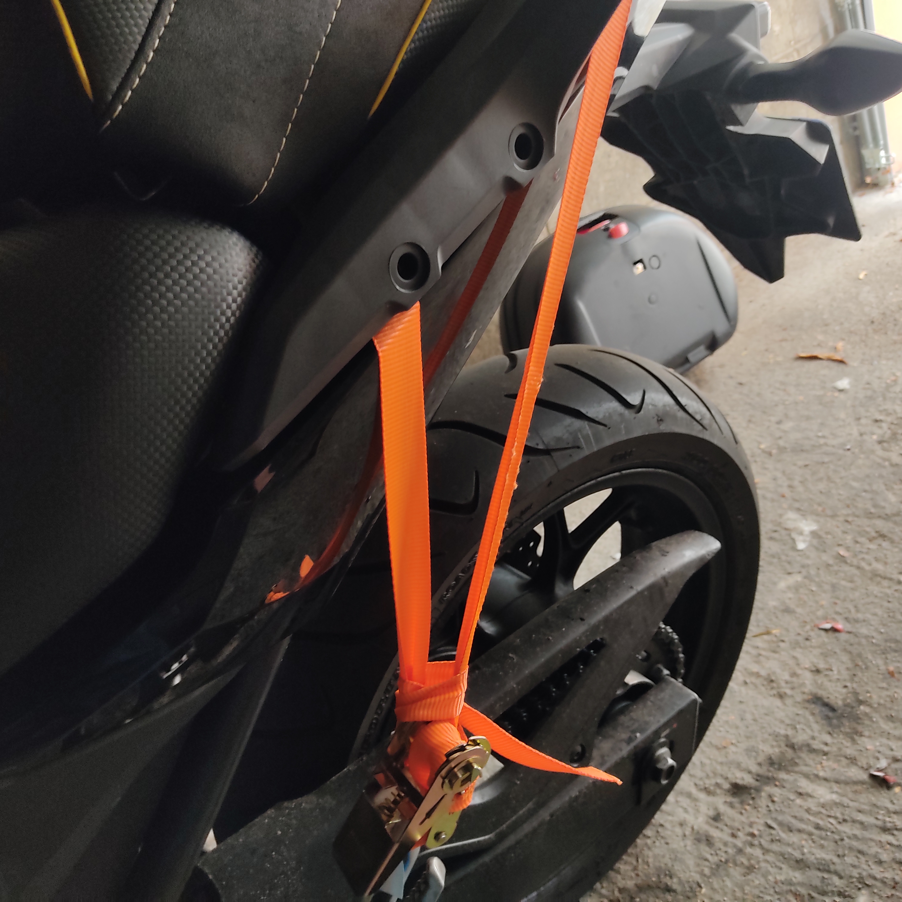Bravo pour cette lumineuse idée, qui s'installe et se désinstalle en un tour de main, se range dans une poche, à la portée de toutes les bourses, qui n'écarte pas exagérément les sacoches, capable de supporter des charges que la boucle AR de la moto ne supportera pas, et qui sert pour bien d'autres utilisations (comme attacher en même temps un sac de selle) !