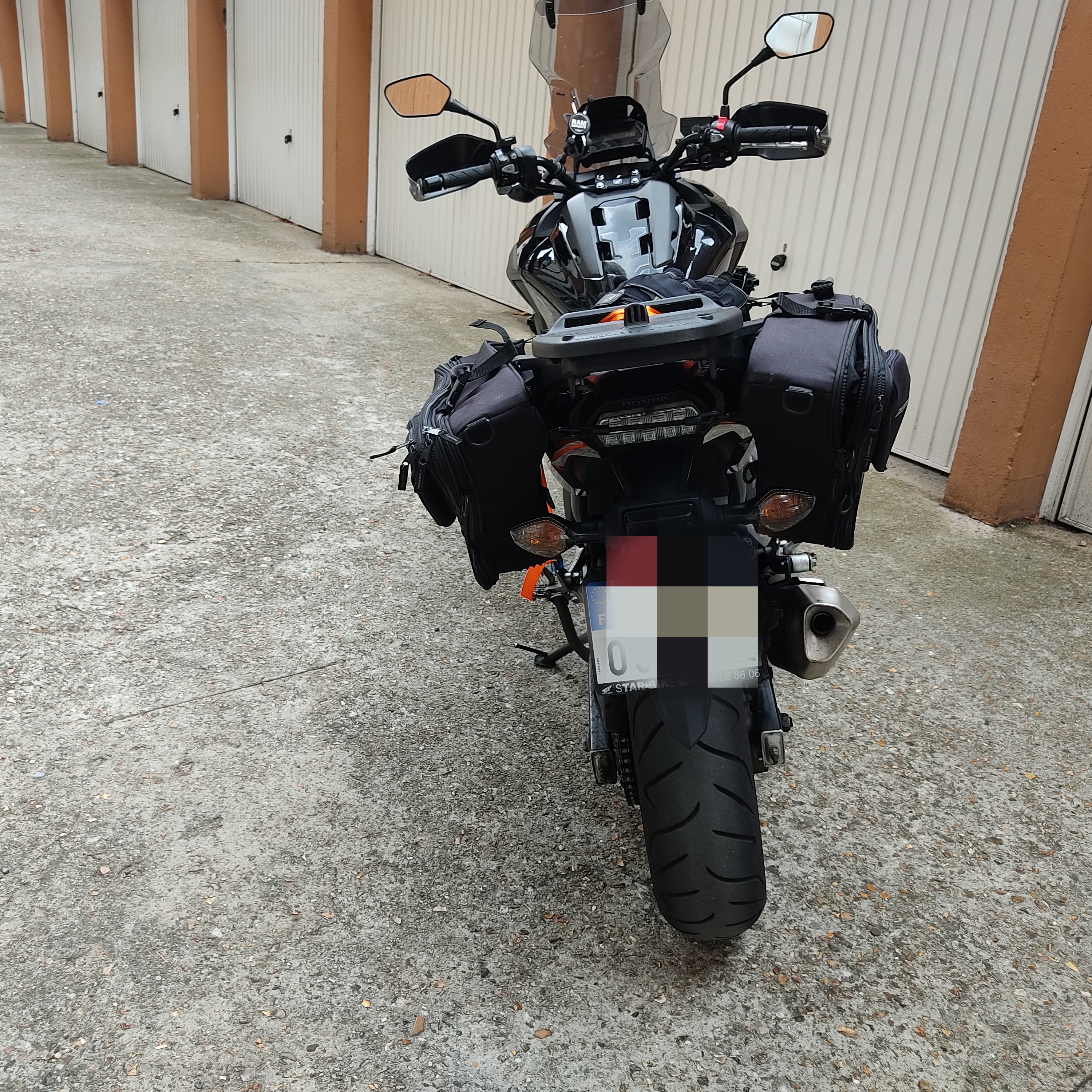 Bulle haute, prise 12 V et béquille centrale Honda, selle Bagster, protège mains, pare moteur et top case V47VN GIVI.