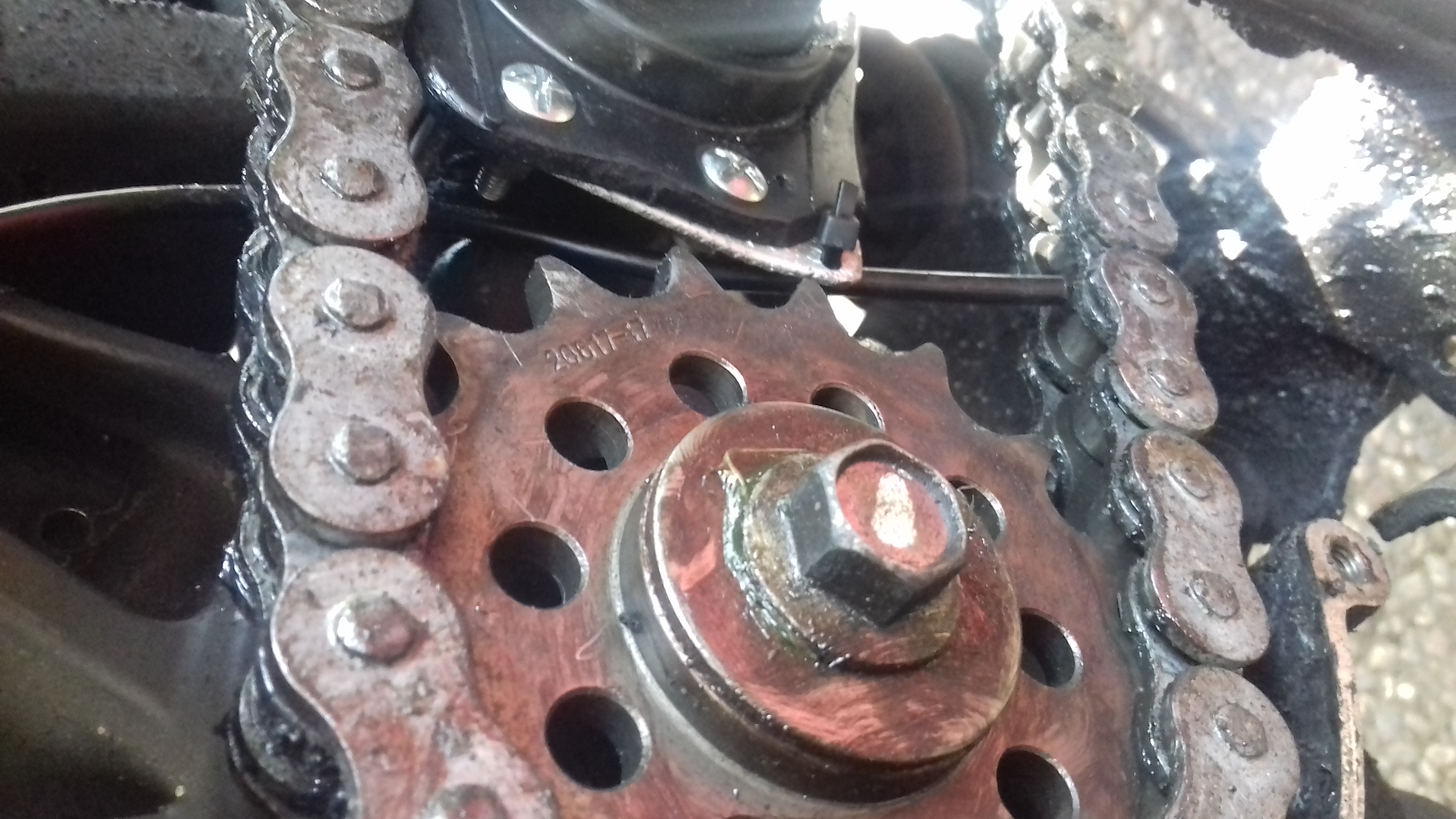 L' huile sort sur le patin , coule partout dessus , et se diffuse ensuite partout sur la chaîne le PSB et la couronne . La transmission secondaire est parfaitement graissée . Pas de points durs sur la chaîne et le jeu latéral commence a être juste décelable .