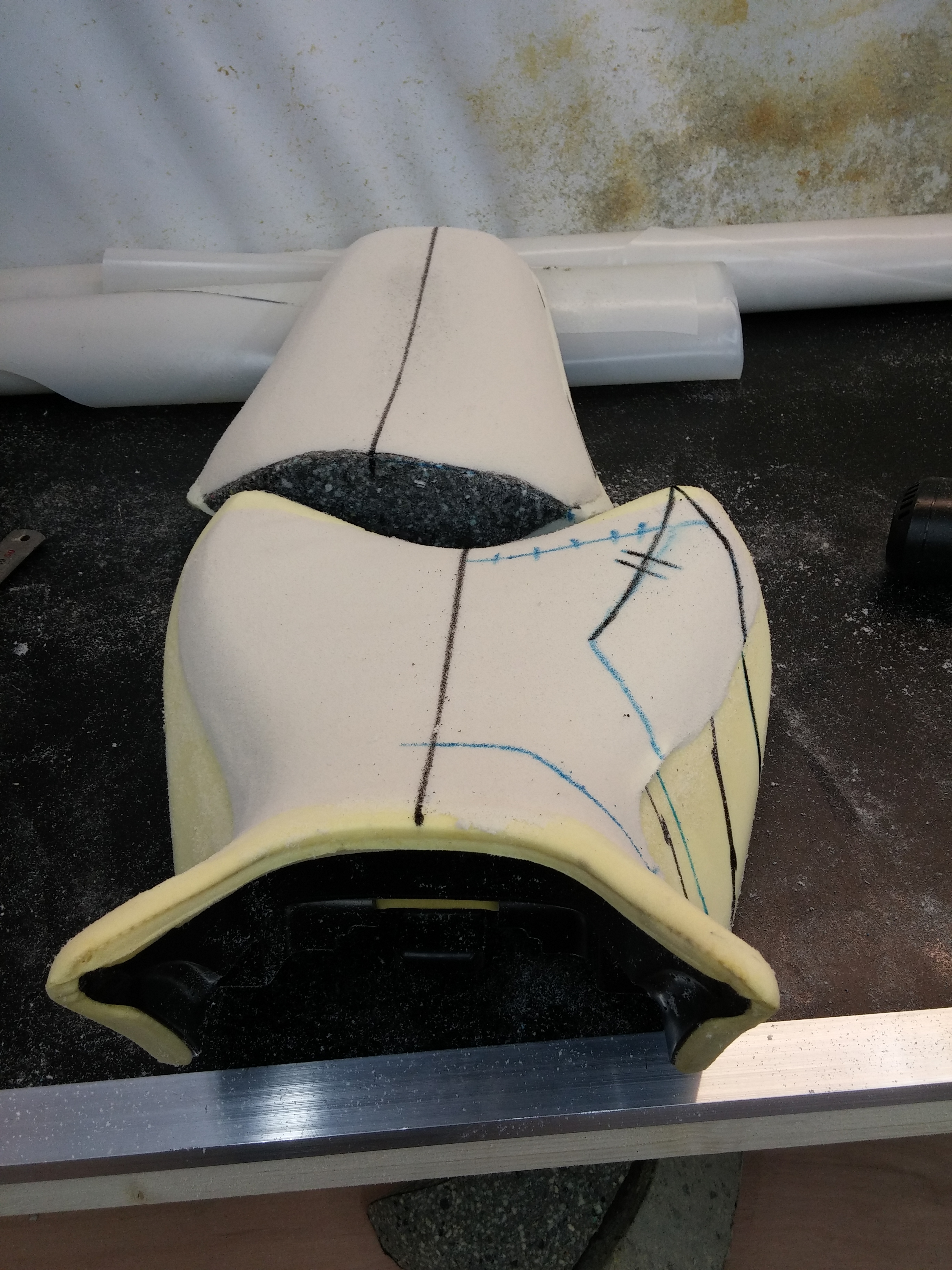 Enfin, le moment de vérité, la "mise en peau" où on a l'impression permanente que tout va se découdre ou s'arracher tellement l'habillage est "bandé" sur la mousse.