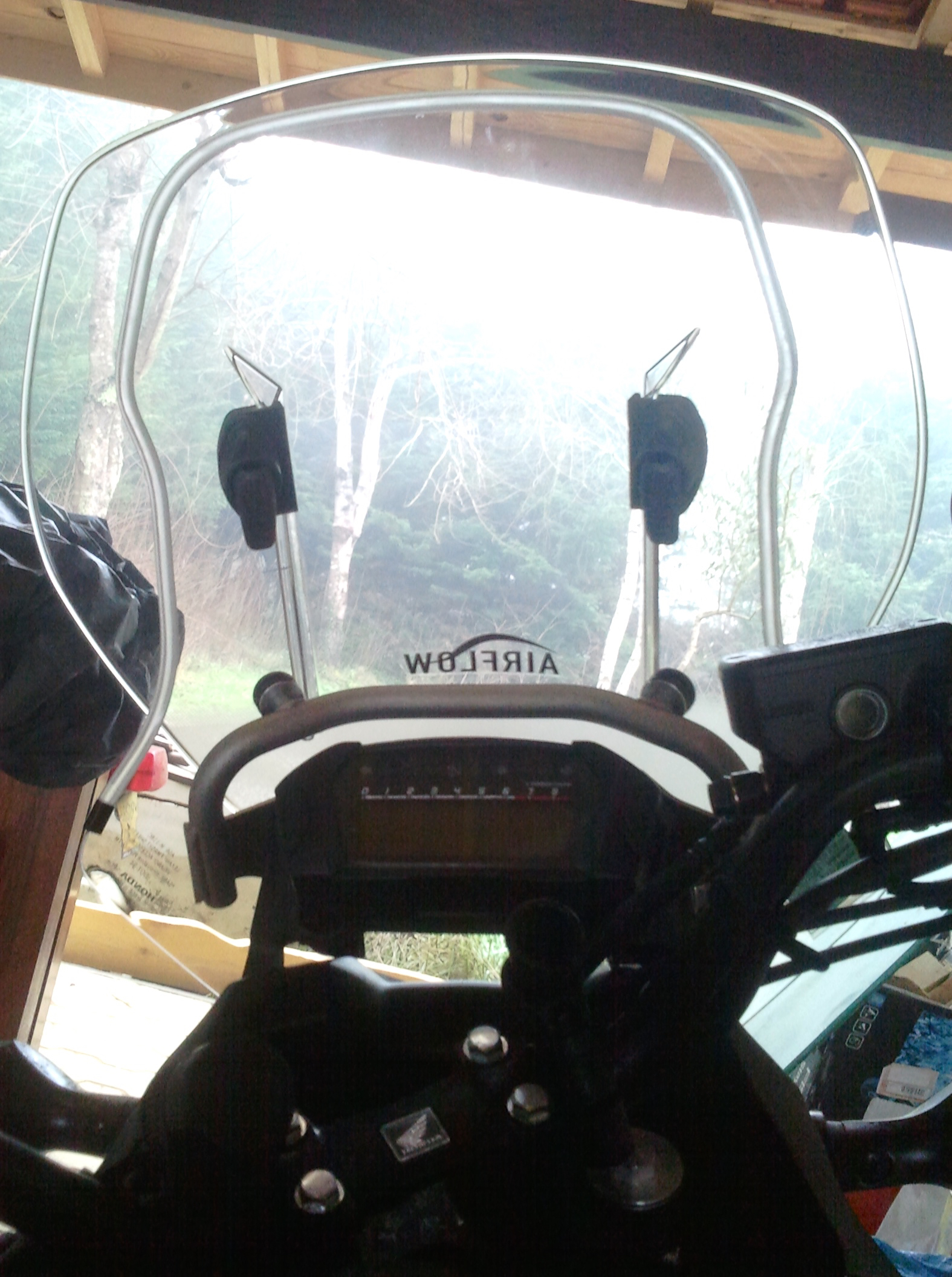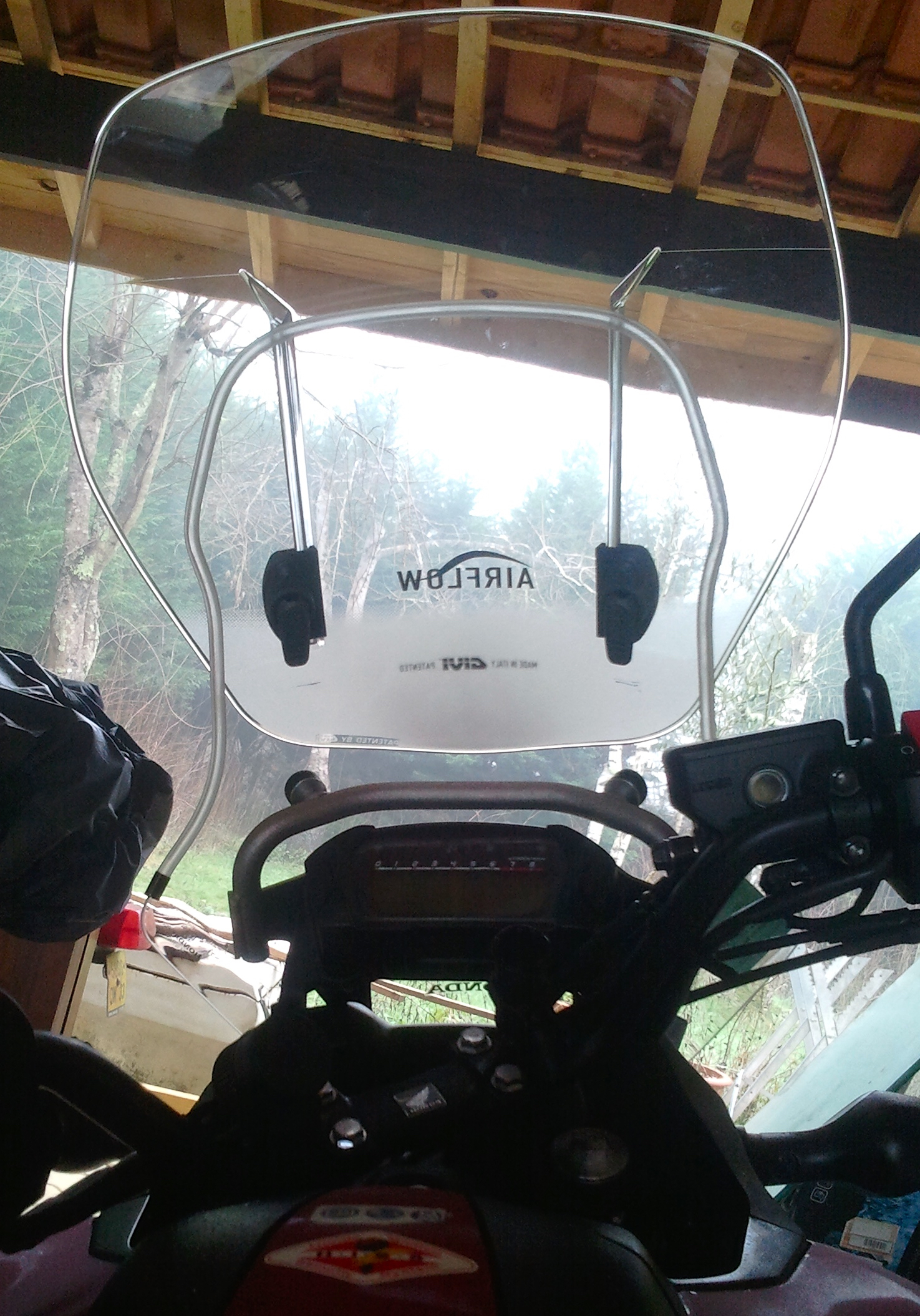 C'est pourquoi j'ai commencé par la bulle haute Honda sur son support (par ailleurs bien pratique pour fixer des accessoires comme le GPS qui se retrouve à un endroit idéal), malgré les insuffisance de cette solution.