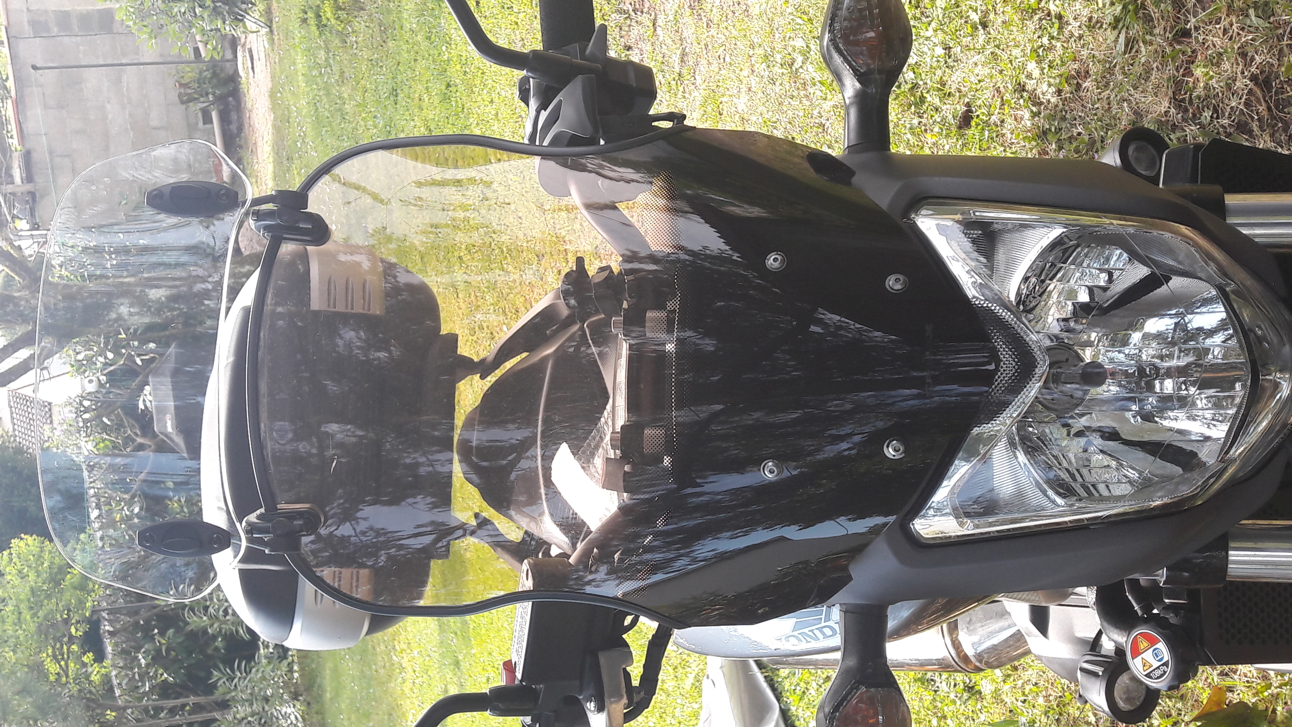 Je pense aussi que le déflecteur est trop haut. J'ai un ensemble bulle haute Honda + déflecteur Puig, ils se chevauchent, et avec mon 1,73 le résultat est pas mal, air au-dessus du casque et peu de remous.