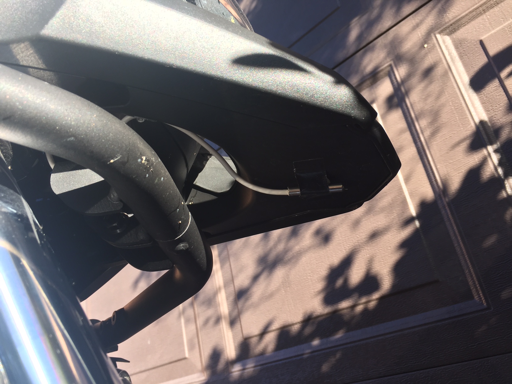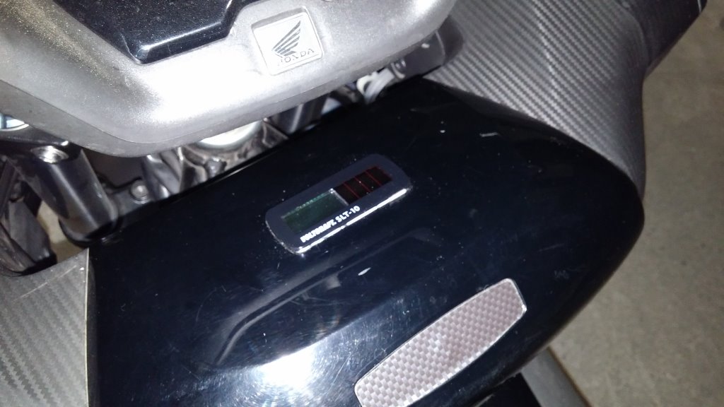 Capteur mis plus bas, la où se fixent les crash bar, j'ai pas mis sous le bec pour être sur de pas le voir. Et j'ai réussi à rentrer le reste du fil derriere une plaque en métal, donc c'est plutôt bien caché. J'ai mis un bout de chambre à air pour pas que ce soit en contact avec le métal et fausse la mesure (même si je sais pas si c'est vraiment utile).
