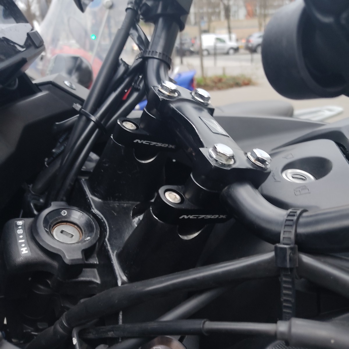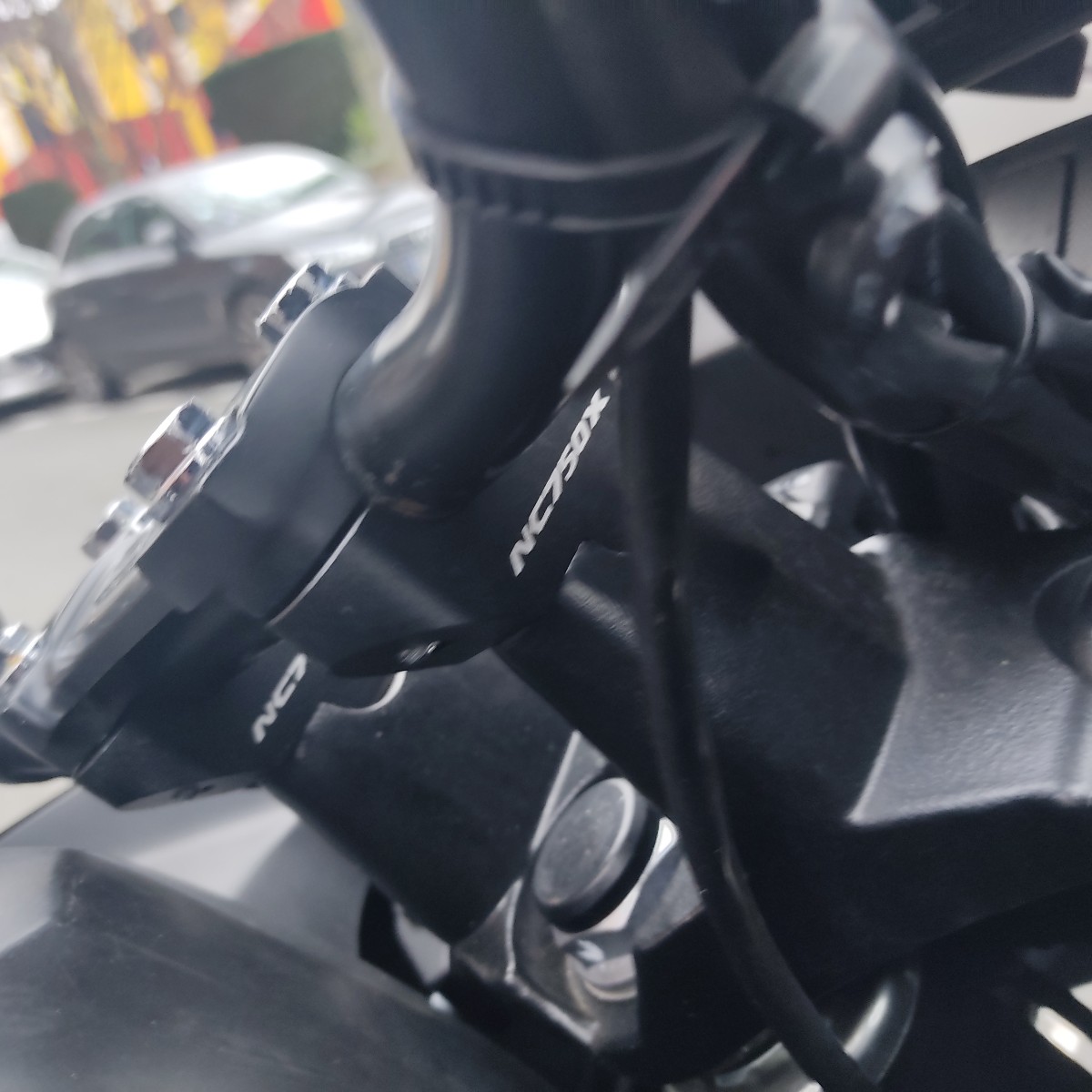 La chinoiserie fait 2cms de rehausse et 2 CMS de déport. 10' pour installer. La durite de frein est à son maximum, j'ai des gros doutes pour l'adaptabilité du motea de 4cms de hauteur et 1,8cm de déport, en tout cas pour la nc750x 2020.