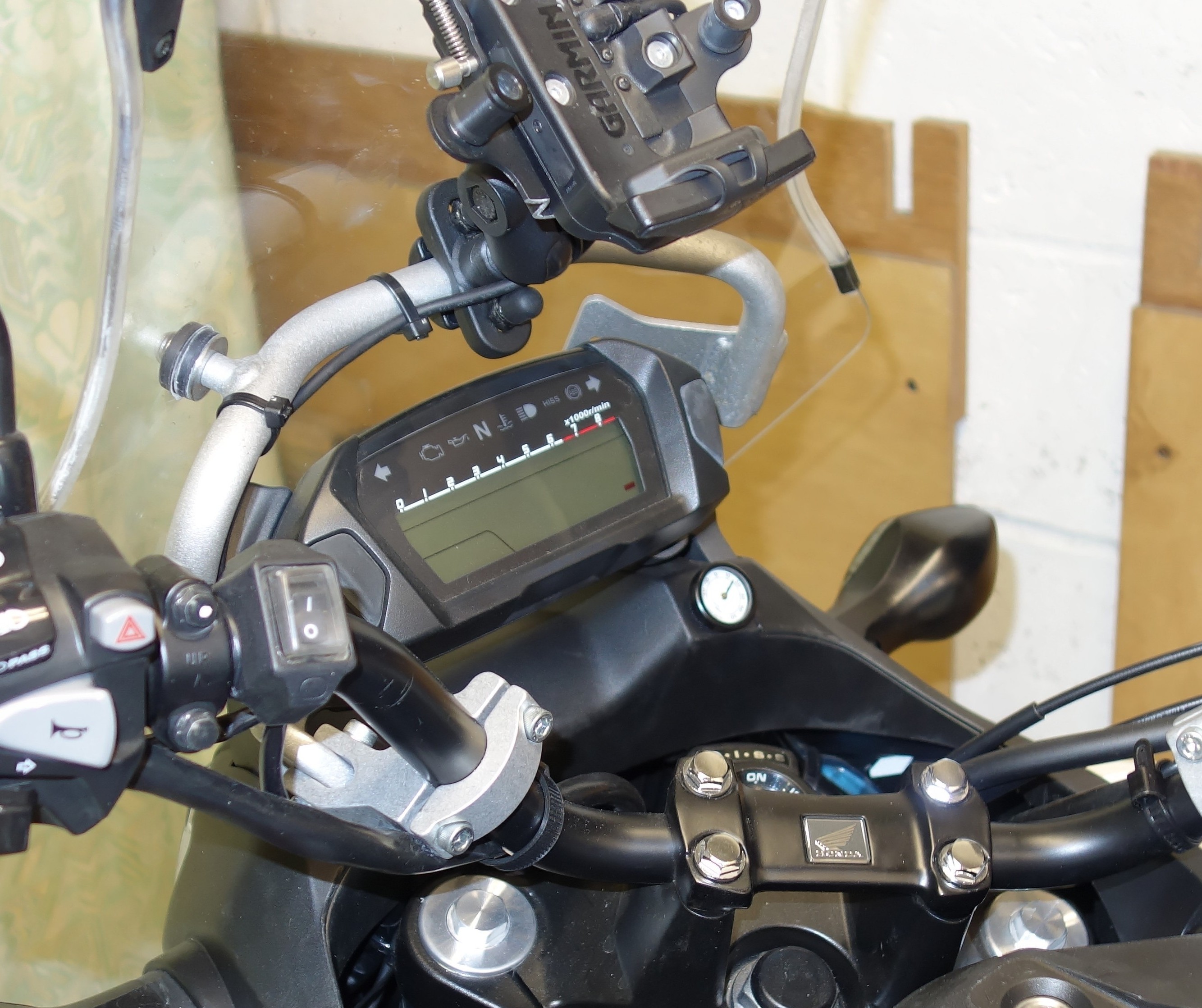 Il me restera donc à fixer quelque part (sur le support métallique de la bulle haute Honda, comme Algo par ex) quelque chose qui se termine par une boule sur laquelle je fixe le bras sus-cité, afin que le berceau se retrouve à peu près au-dessus du compteur.