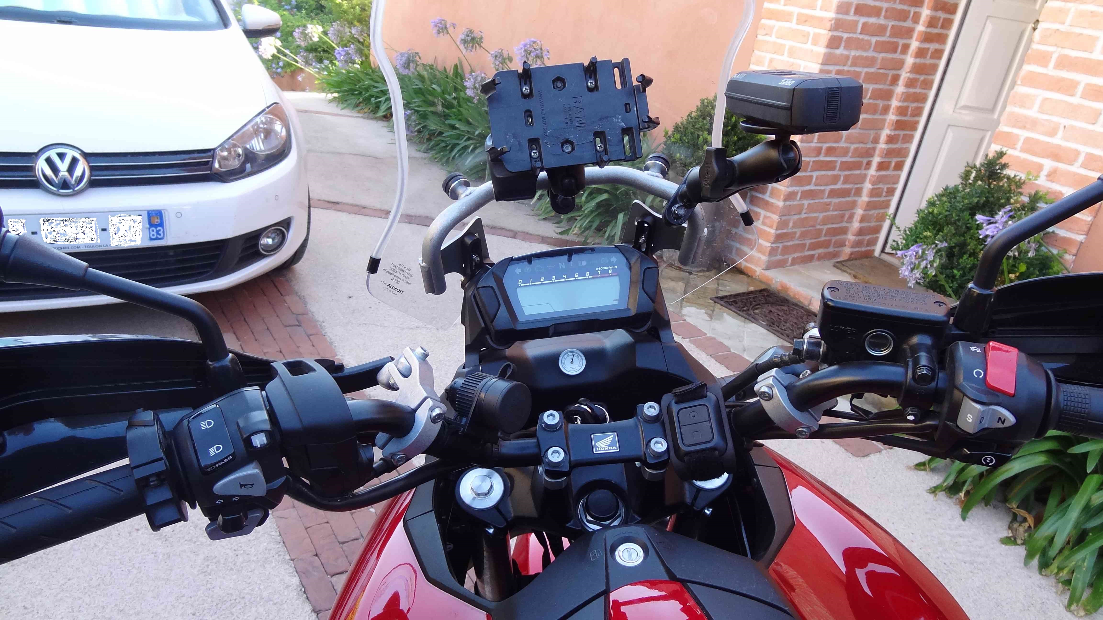 J'ai eu un peu de mal à trouver un emplacement pour la télécommande Drift (record et stop) sur un guidon déjà pas mal encombré : télécommande comm du casque sur poignée gauche, les attaches des protège-mains, le prise allume-cigare pour le GPS et la recharge de batterie, la télécommande de la caméra, attention à la concentration sur la conduite.....