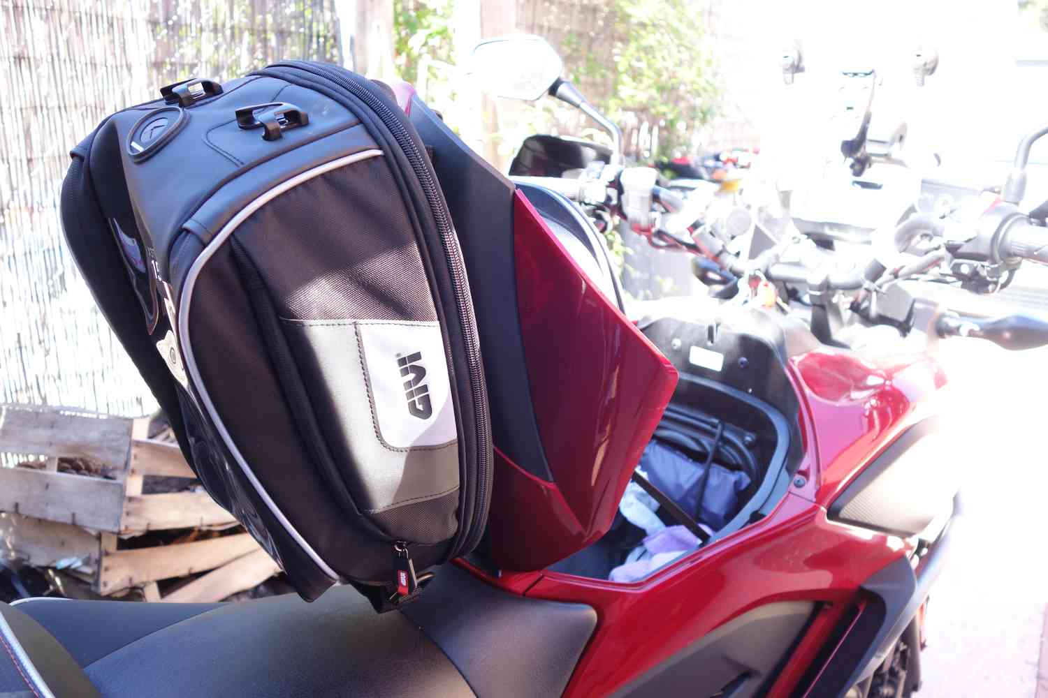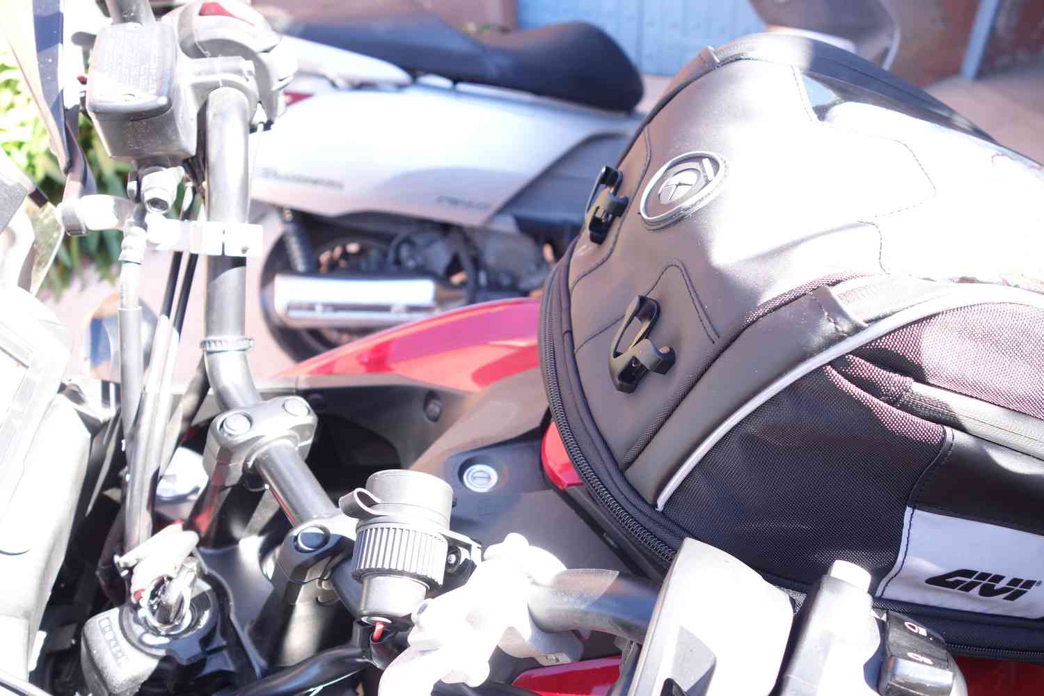 Je vais peut-être franchir le pas avec une petite sacoche Givi (la XS307 avec son porte carte, c'est beaucoup pour ça ...) et la bride Tanklock qui va bien.