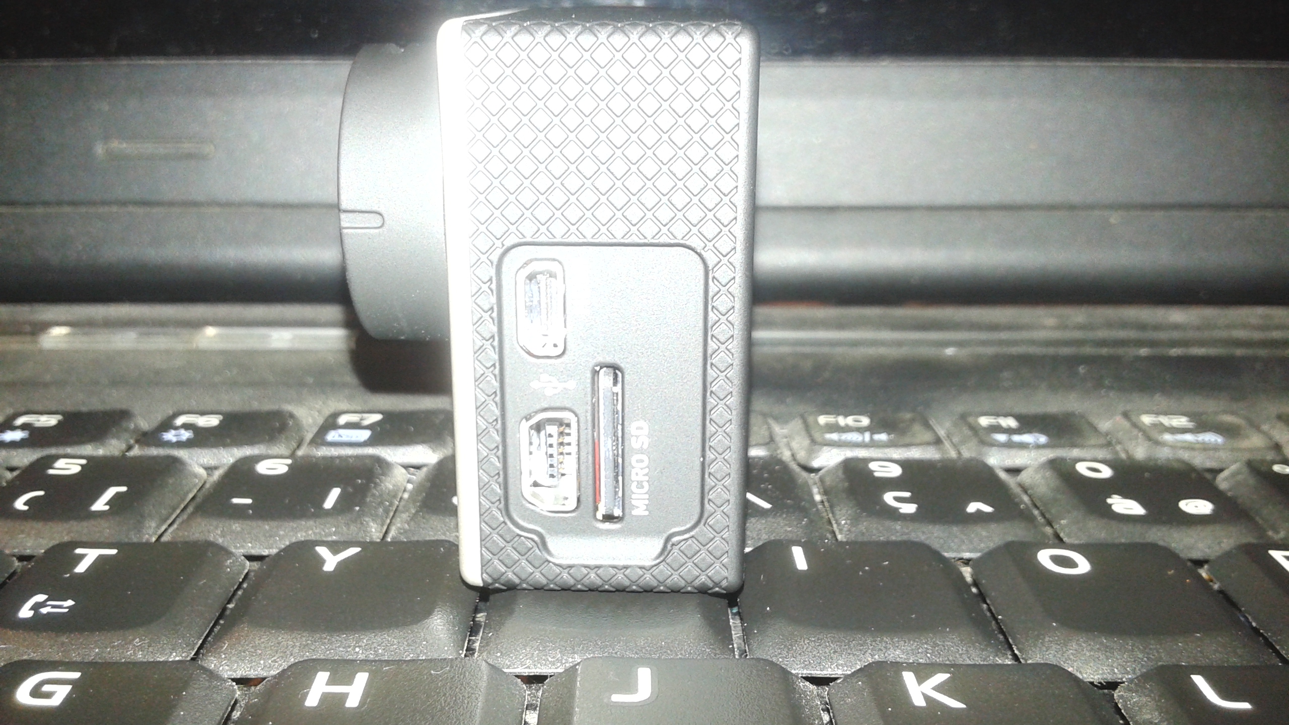La caméra possède un petit emplacement pour y loger la carte MicroSD, un port mini-USB et un port mini-HDMI.