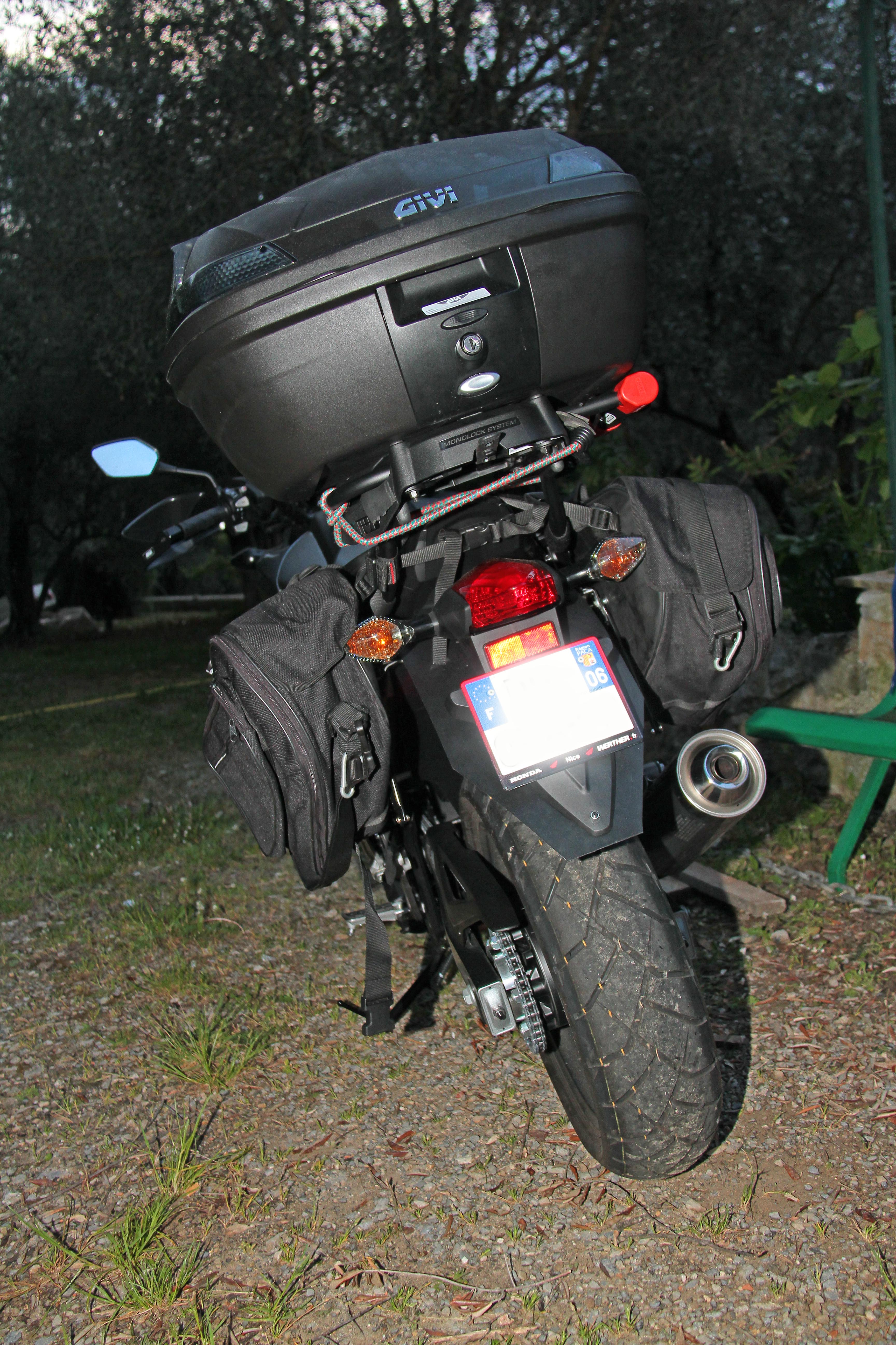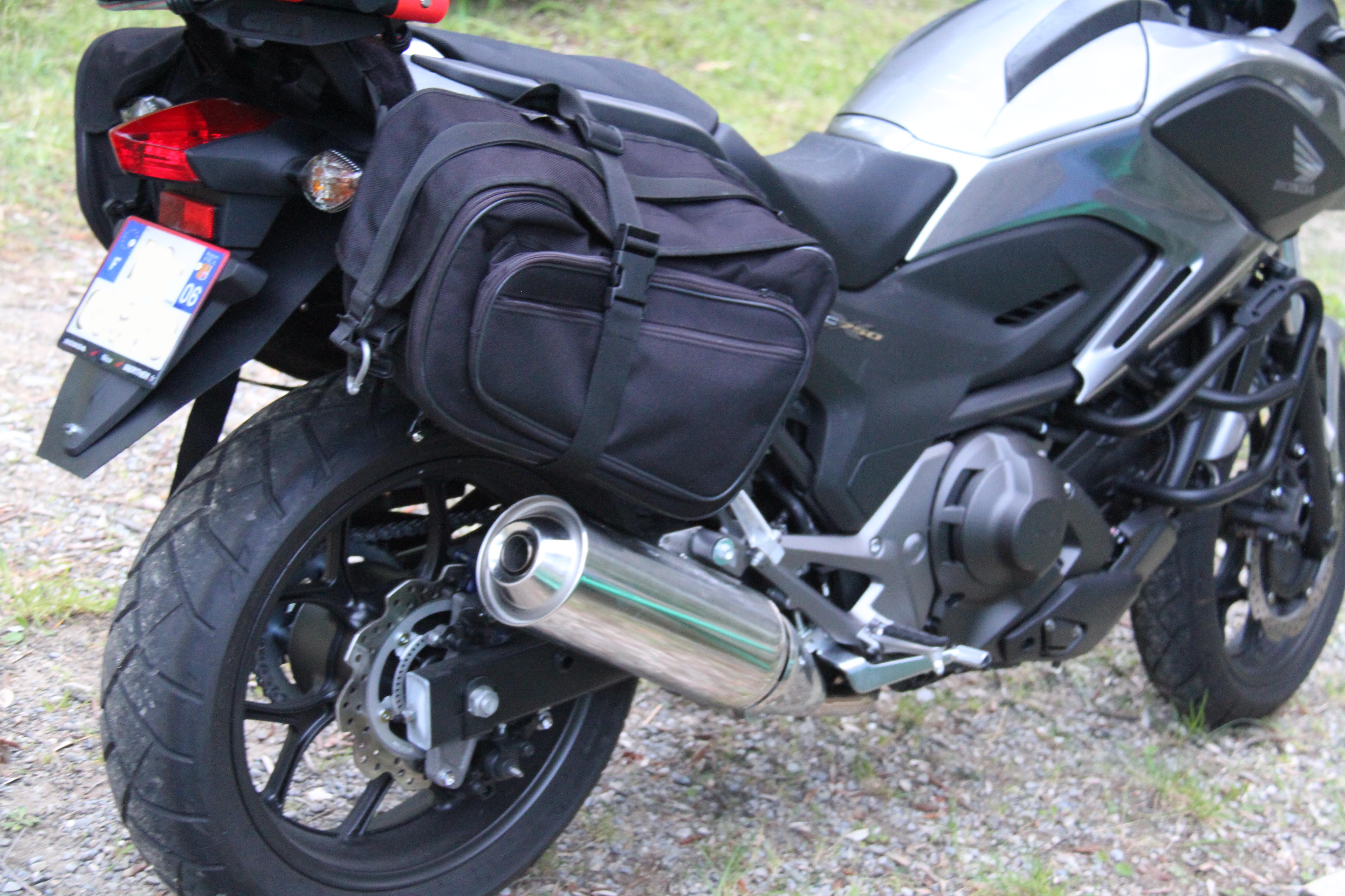 Merci a vous deux, concernant les bagages, cela fait 70 cm en tout. Position normale 18 cm chaque sans ouvrir les soufflets, plus 34 la moto avec les écarteurs.