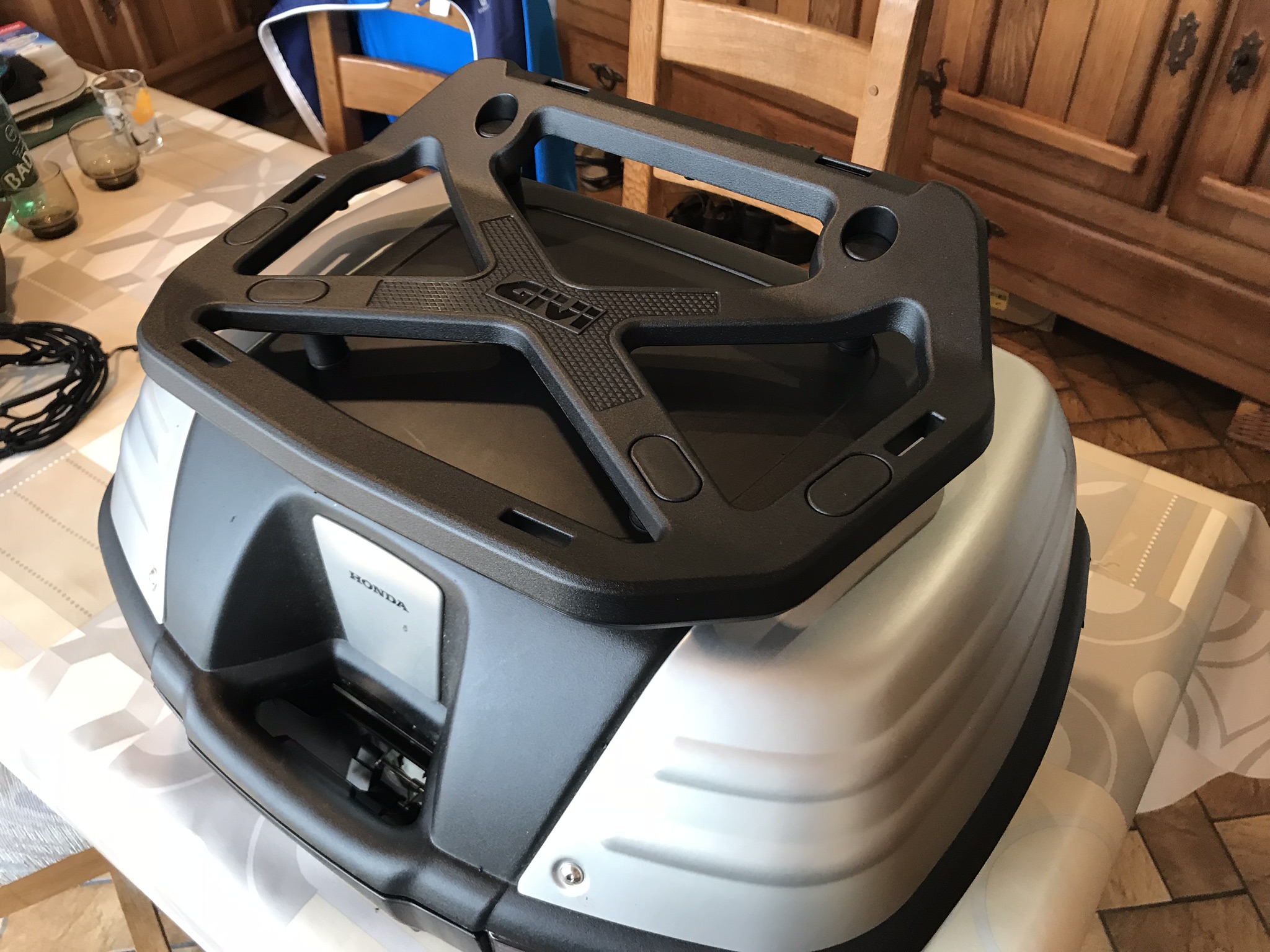 Pour un peu d’emport en plus...j’ai fait l’acquisition d’un porte bagage Givi Universal Rack SV150 que j’ai installé sur mon Top case Honda...(. 3/4 heure pour bien mesurer et forer les 4 trous à la bonne place et l’instaLatino.)