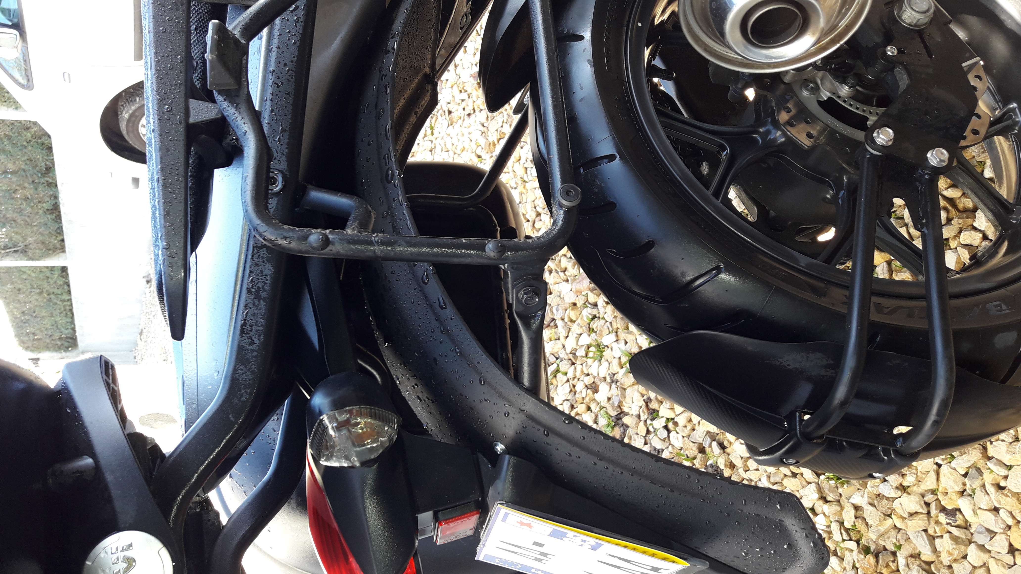 3. Garde boue en abs noir mat de tracteur (30e sur agrizone): même texture un peu rugueuse que l extérieur du fond des valises et top case. Fixé sur la barre arrière du support valises.et colliers à l avant plus une vis sous la plaque d immat.