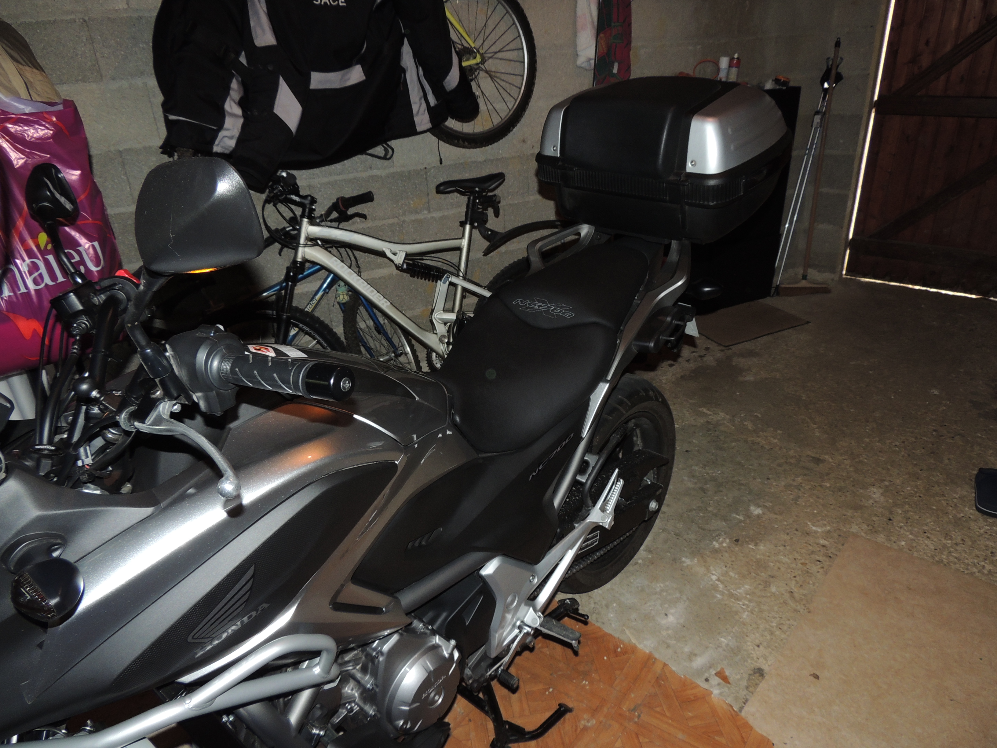 NC 700 X noire boîte manuelle, bulle Secdem HP, prolongateur de garde-boue avant Pyramid, lèche-roue arrière Skidmarx, Topcase 45l Honda, prise DIN allume-cigare dans le coffre.