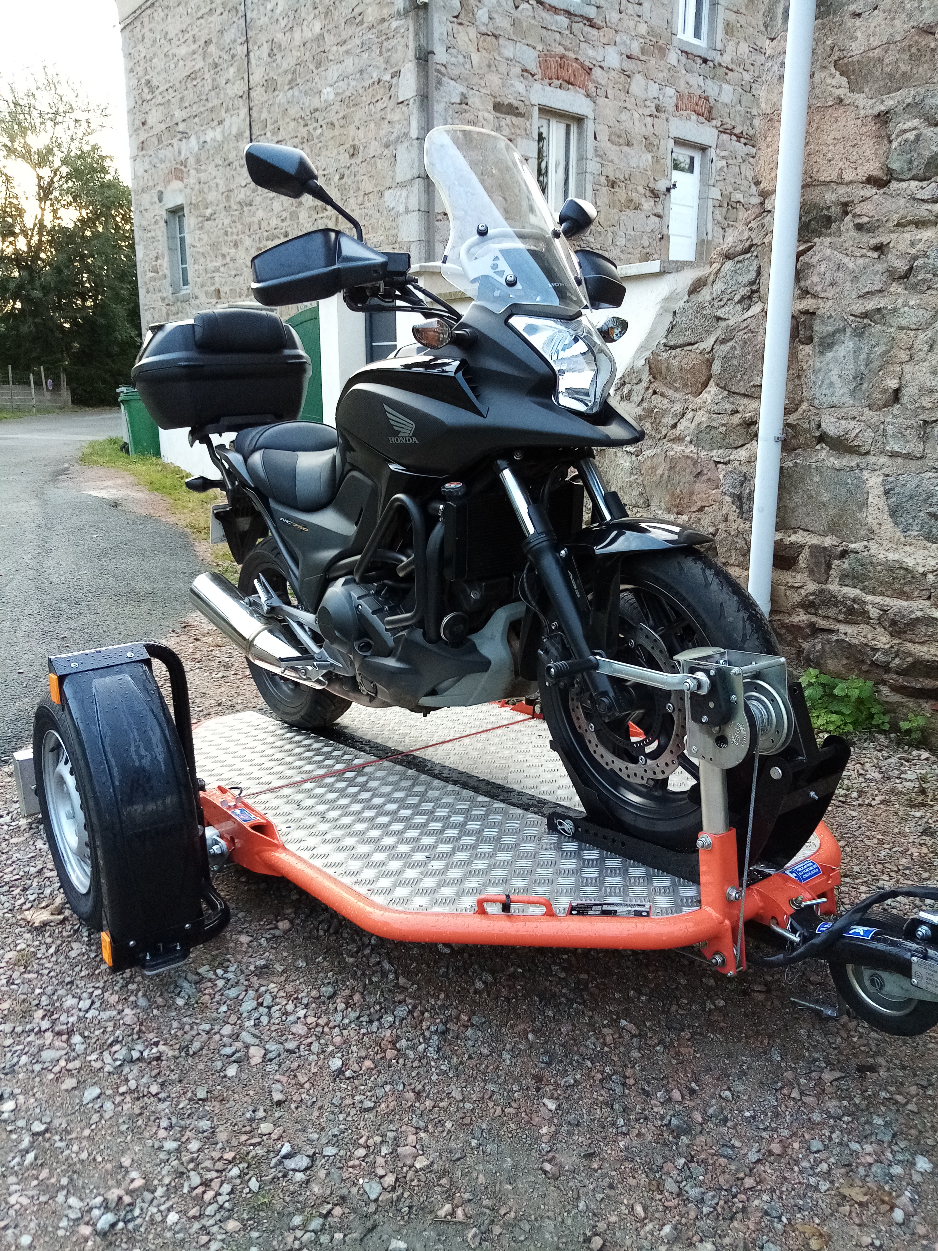 Bonjour, comme toi, j'emporte ma NC avec une remorque UNO Cochet , la plus simple d'utilisation, plateau qui s'abaisse treuil et bloc roue, ce qui me permet de la monter seul avec le moteur sans problème. Effectivement, ça coûte un bras. Nous voyageons avec l'application RBNB pour faciliter le parking de la remorque et utilisons soit notre véhicule, soit la moto.