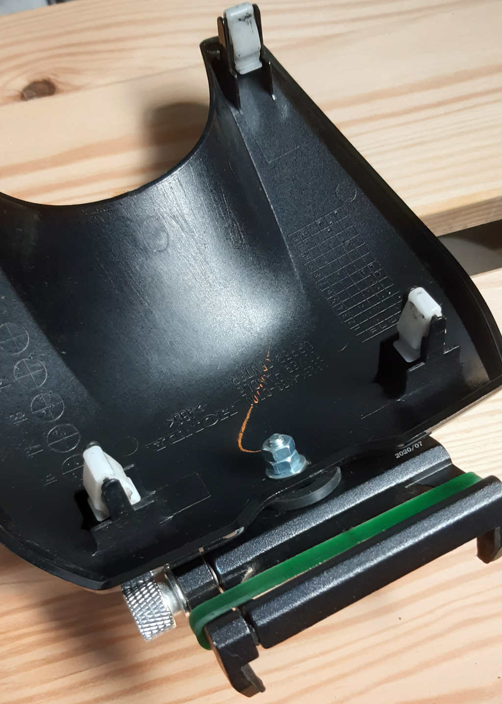 L'envers du décor. Dans un deuxième temps, je vais utiliser une rondelle de diamètre supérieur pour mieux répartir le poids et troquer les deux écrous pour un écrou freiné. Remarque la rondelle caoutchouc "antivibration".