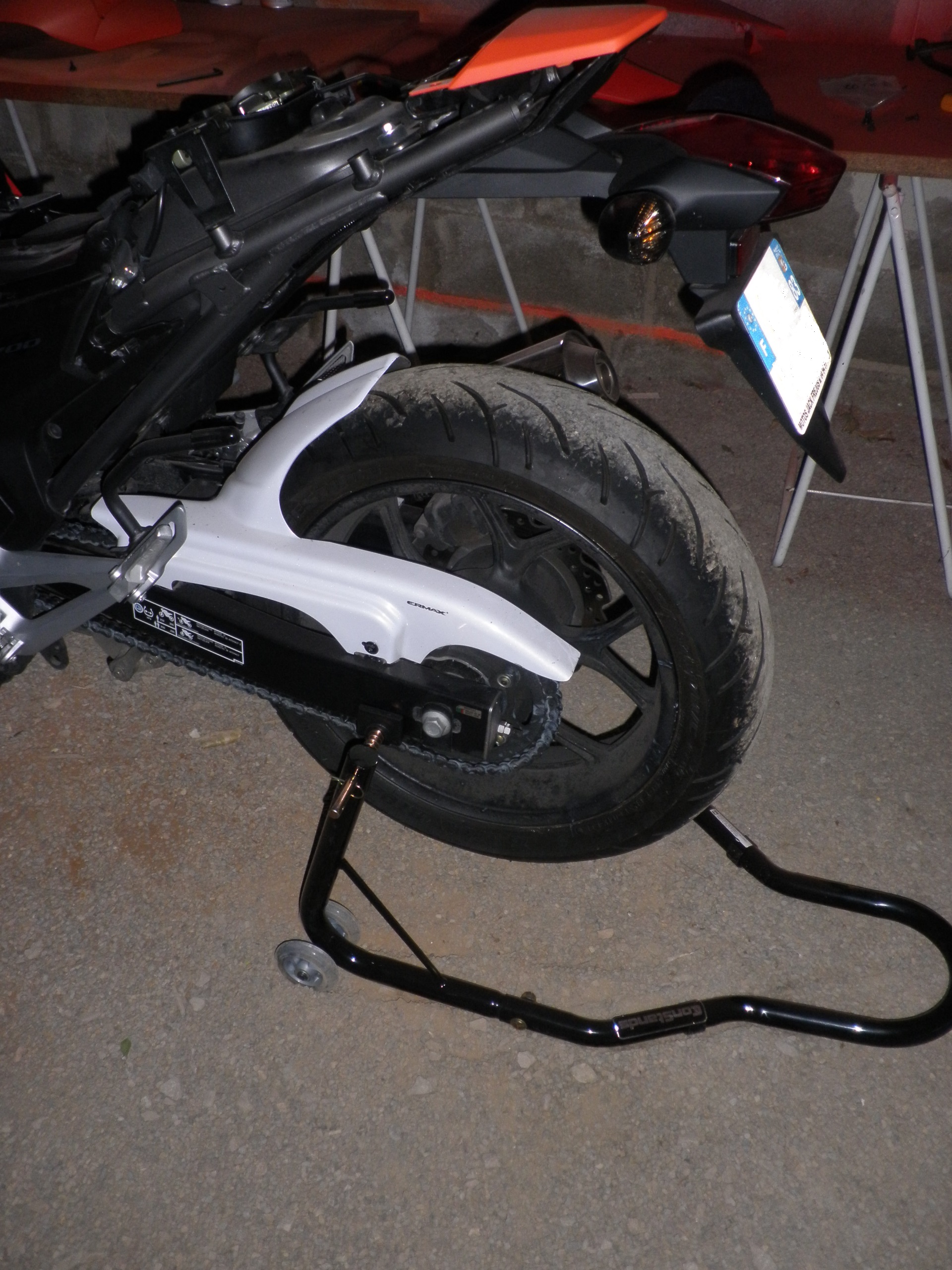 C'est vrai que j'ai eu besoin de l'aide de ma moitié car avec mon bras en compote et le sol du garage qui n'est pas idéal pour soulever la moto.